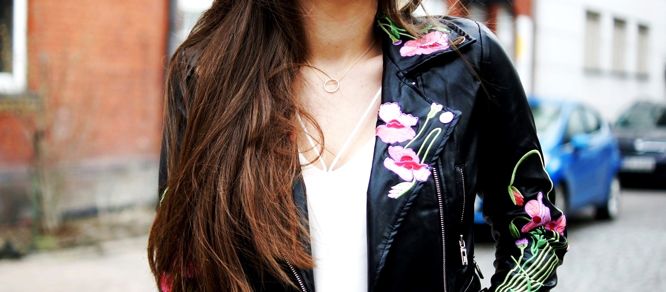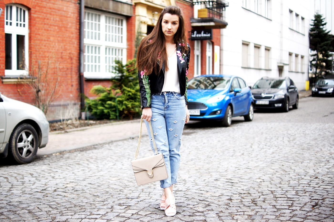 Wiosenne zestawienie uzupełnia ramoneska z haftowanymi kwiatami.