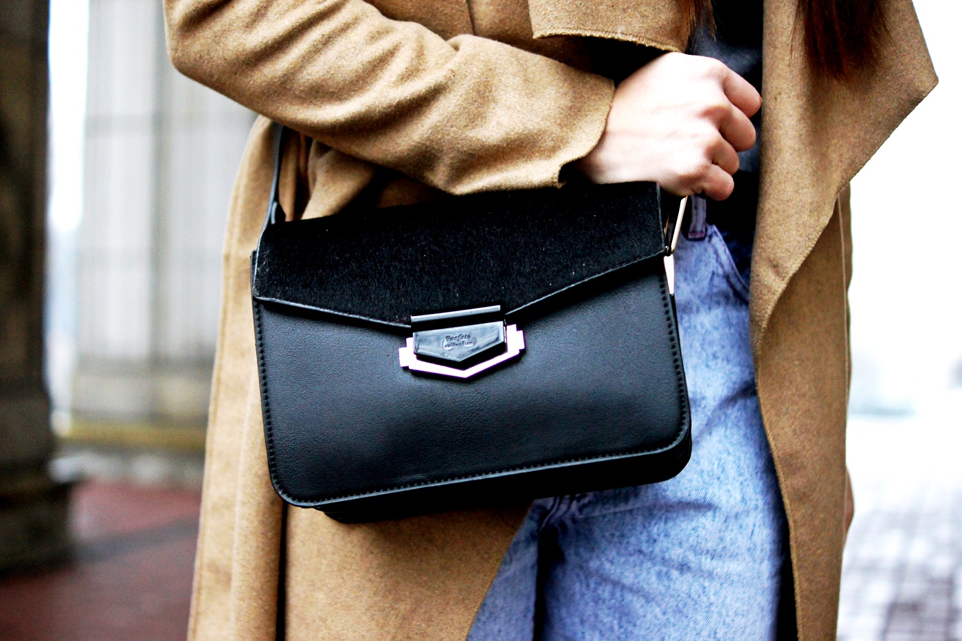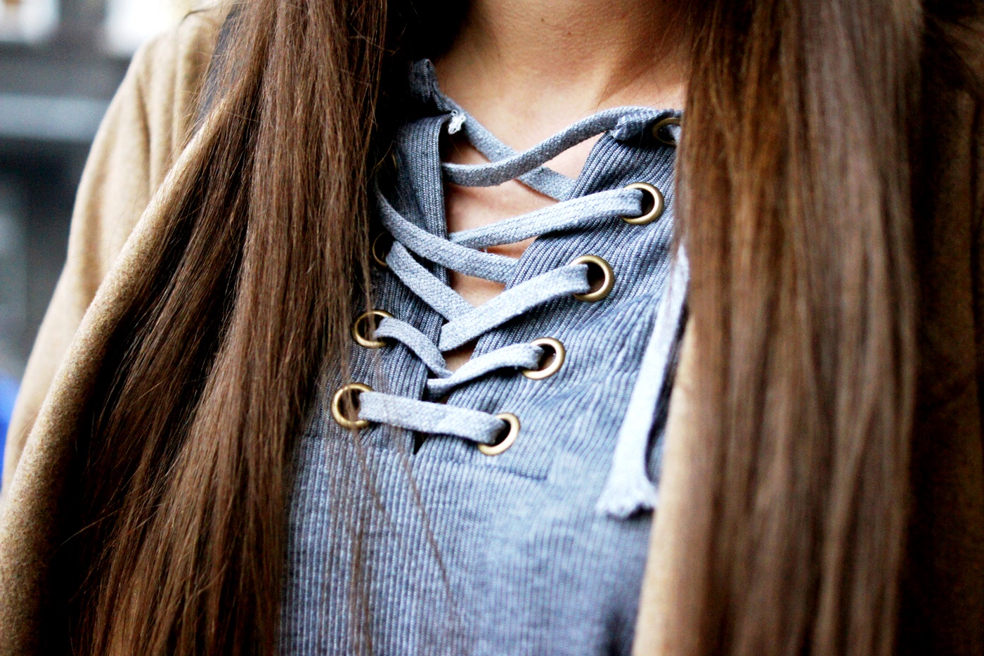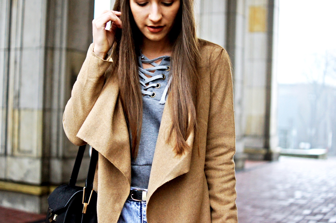 modną bluzą ze sznurowaniem i długim płaszczem w kolorze camel.