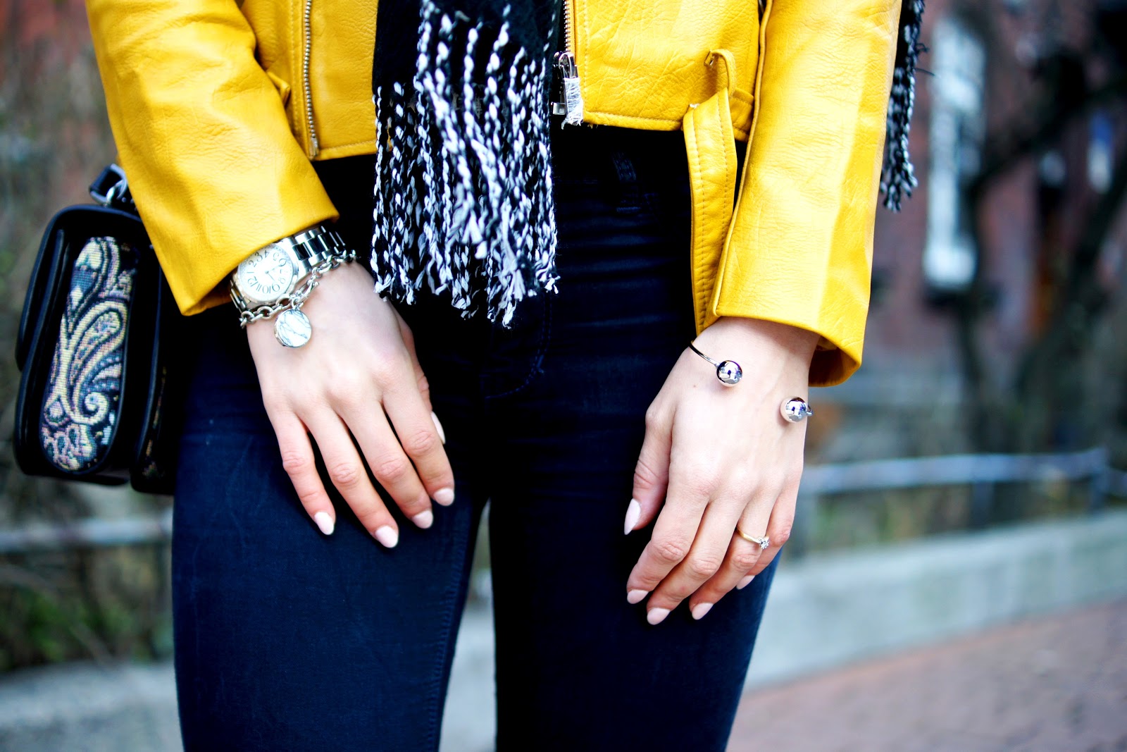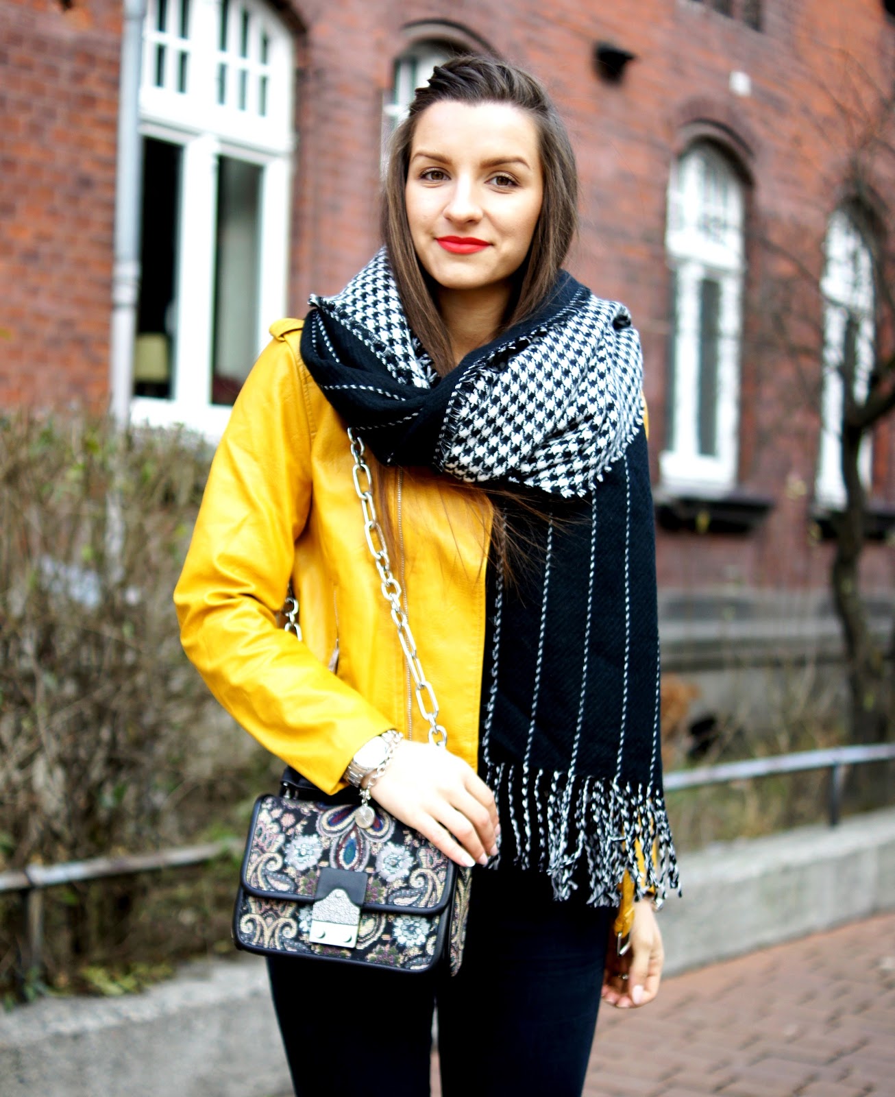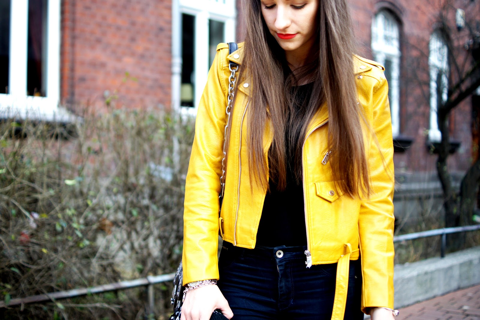Musztardowa ramoneska fajnie ożywia jesienny look, w którym głównie panują ciemne kolory.