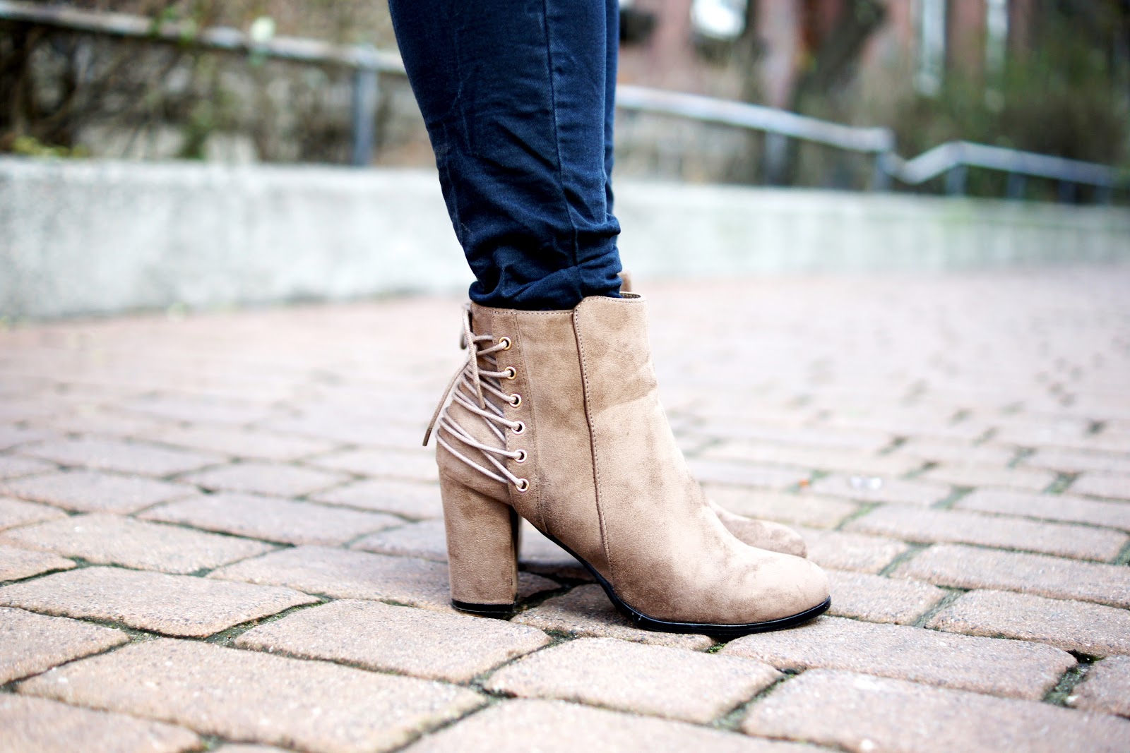 i zamszowymi botkami na niewysokim słupku.