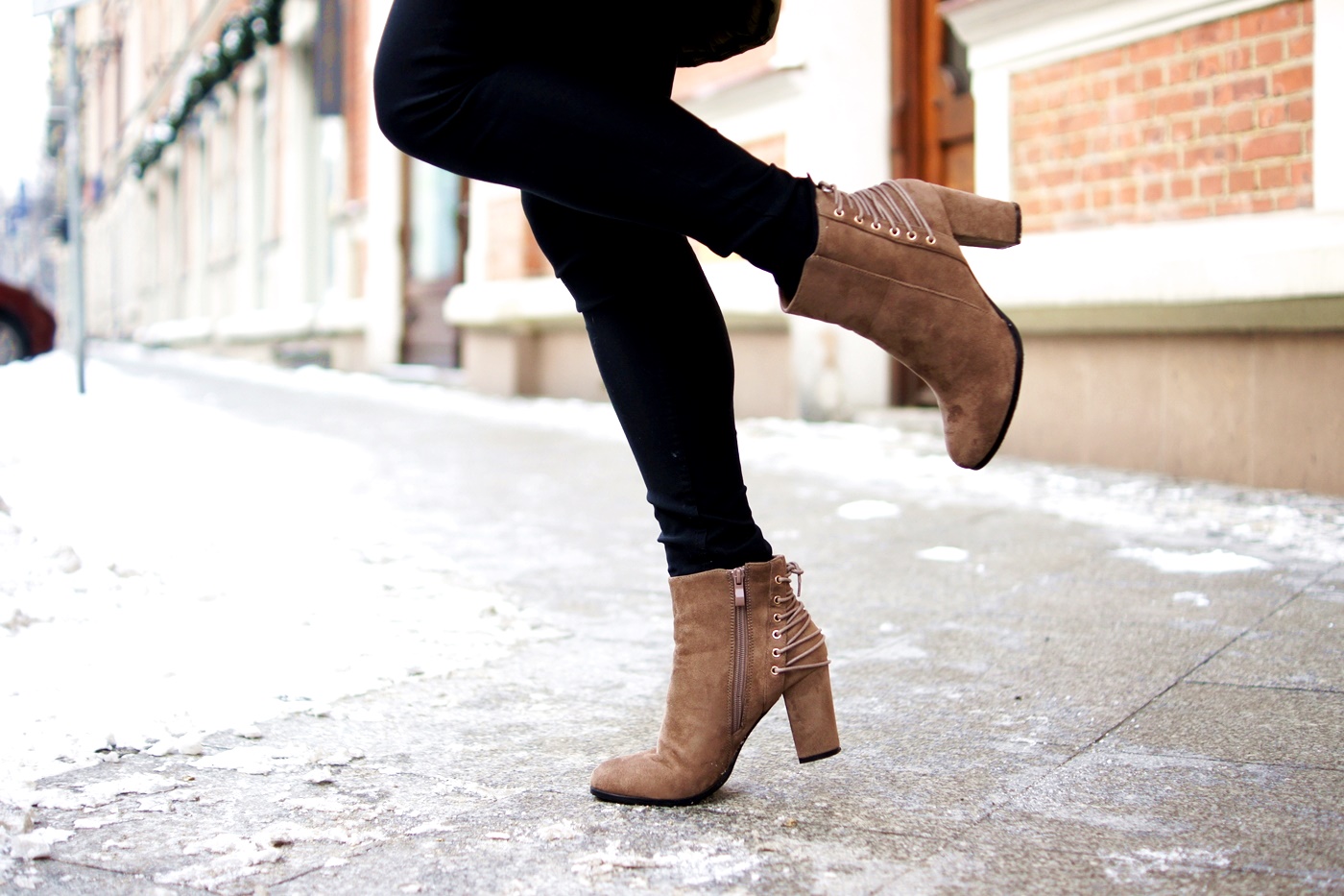 Ciepły zimowy look, którego głównym elementem jest parka z różowym futerkiem.