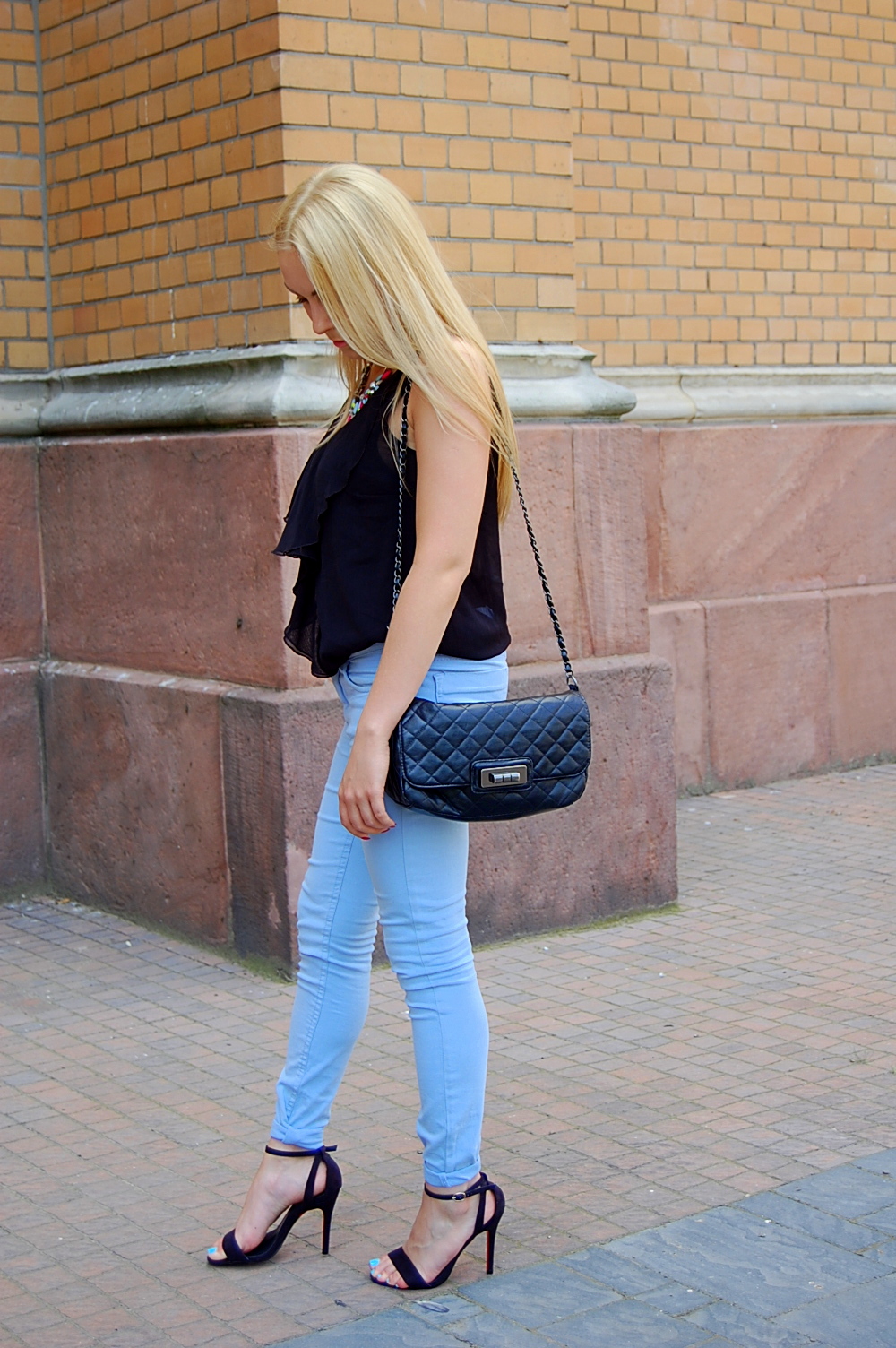 W dzisiejszej stylizacji postawiłam na kontrast czarnej szyfonowej bluzeczki z błękitnymi spodniami i bogatym kolorystycznie naszyjnikiem. Do tego delikatne sandałki na szpilce i mała czarna torebka na łańcuszku.