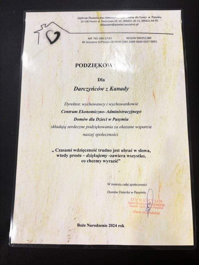 Poniżej zamieszczamy podziękowanie z placówki Domu Dziecka w Pasymiu.