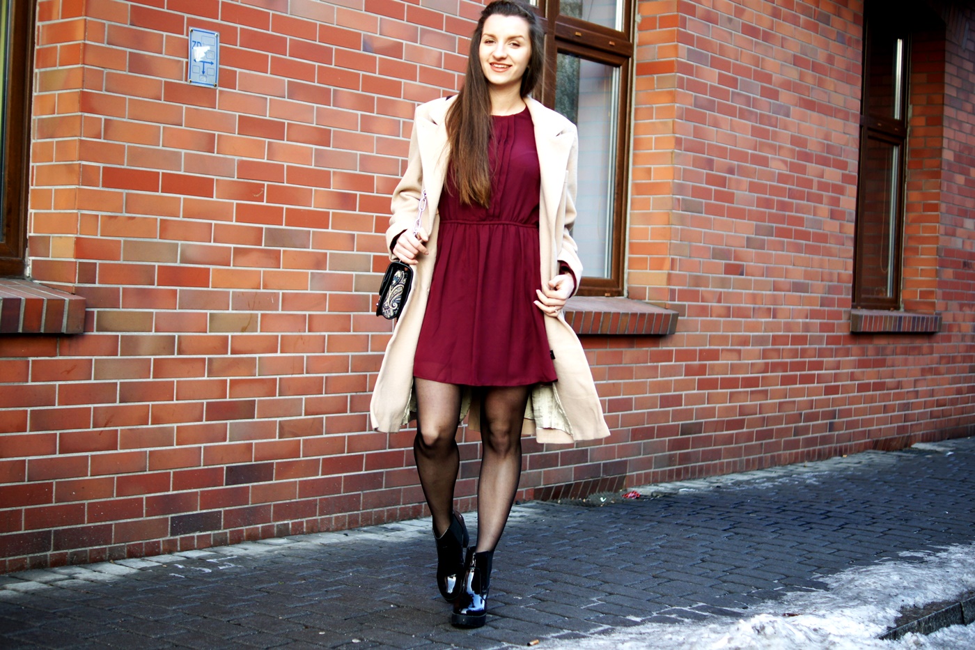 Sukienka w kolorze wina i długi płaszcz nude zestawione z ciężkimi, lakierowanymi botkami.