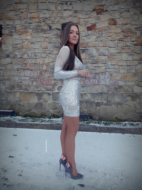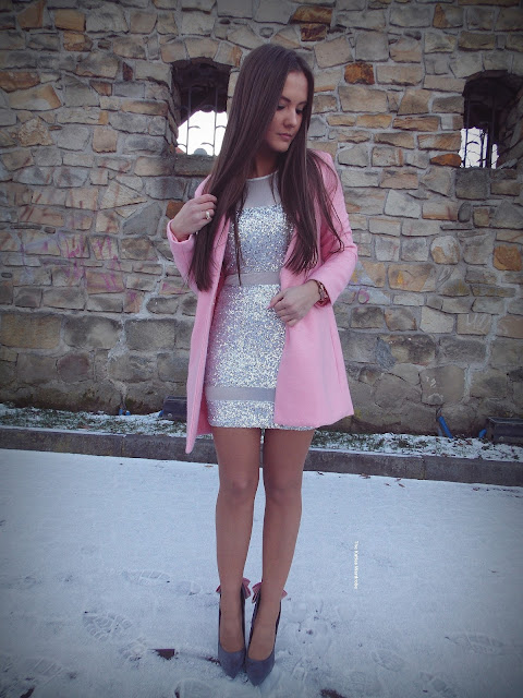 Dzisiaj propozycja Sylwestrowa:),srebrna, cekinowa sukienka połączona z szarymi szpilkami z dodatkiem pudrowego różu w postaci kokardek oraz płaszcza( w rzeczywistości jest on bledszy;)) i na koniec: