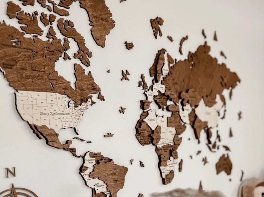 Drewniana mapa świata na ścianę przyciągająca wzrok