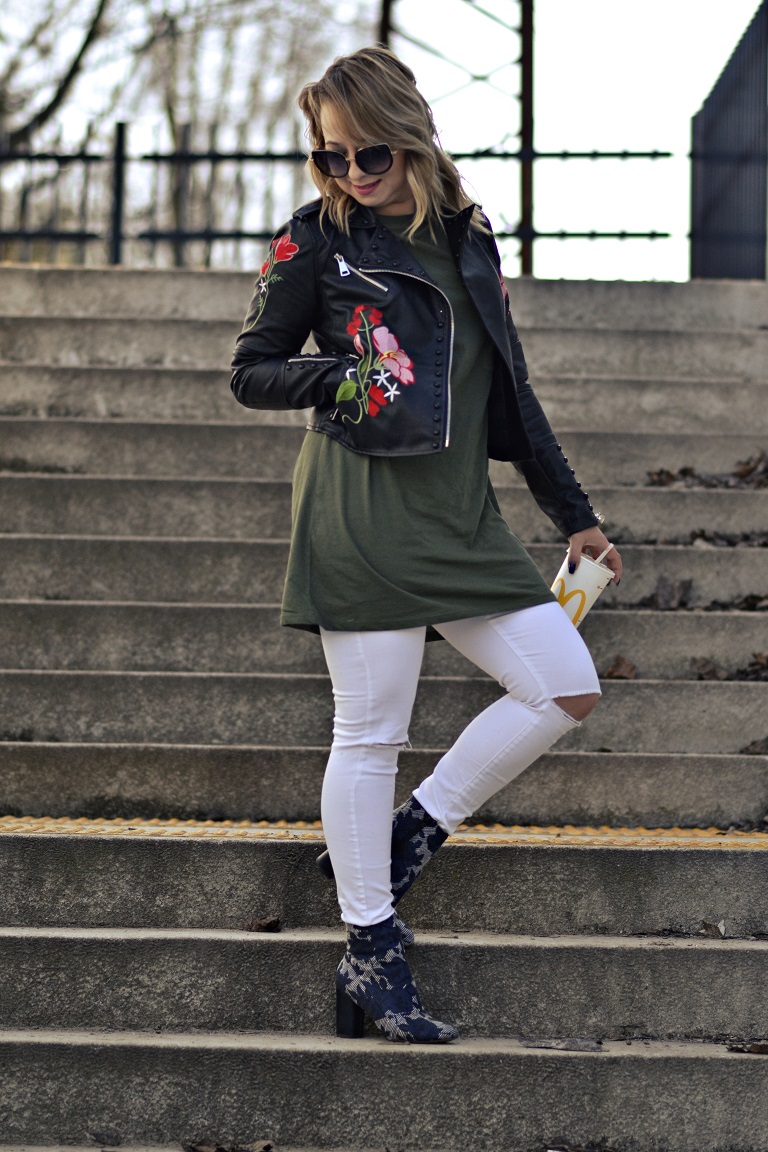 Kilka słów o OOTD: Ramoneska to mój zdecydowany faworyt i nie mam na myśli akurat tej konkretnej, chociaż hafty na niej to taka kropka na 'i' . Żeby nie było tutaj zbyt nudno to dodałam do prostej stylizacji, czyli białych rurek i długiego t-shirtu również wzorzyste botki , które teoretycznie gryzą się z haftami, jednak mi to wszystko pasuje. Nie wszystko musi być zawsze dopracowane prawda?! :)