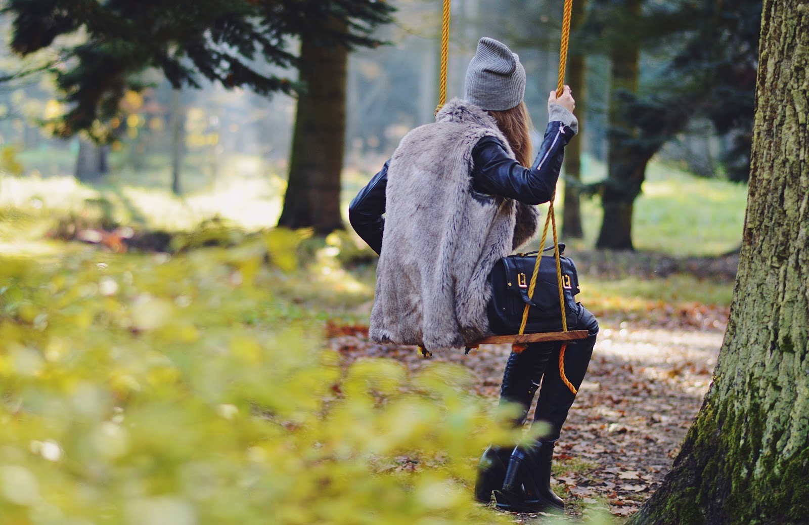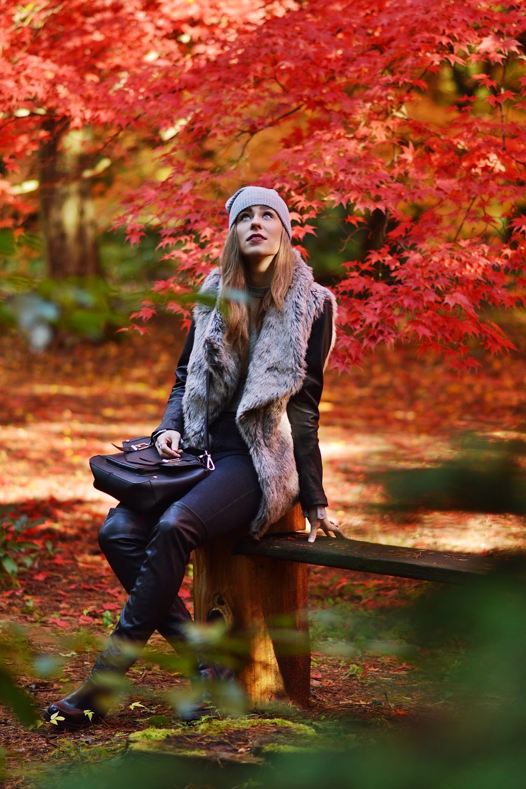 Co do zestawu, chciałam, żeby było mi przede wszystkim ciepło i tutaj idealnie sprawdziło się połączenie ramoneski i futrzanej kamizelki. Do tego skórzane muszkieterki idealnie grające z rękawami kurtki, torebką i paskiem, a dla rozjaśnienia całości szara prążkowana bluzka i czapka. Bluzka ma interesujący dekolt, który może być alternatywą dla bardzo modnych sznurowań, jeżeli komuś takowe się już np. przejadły.