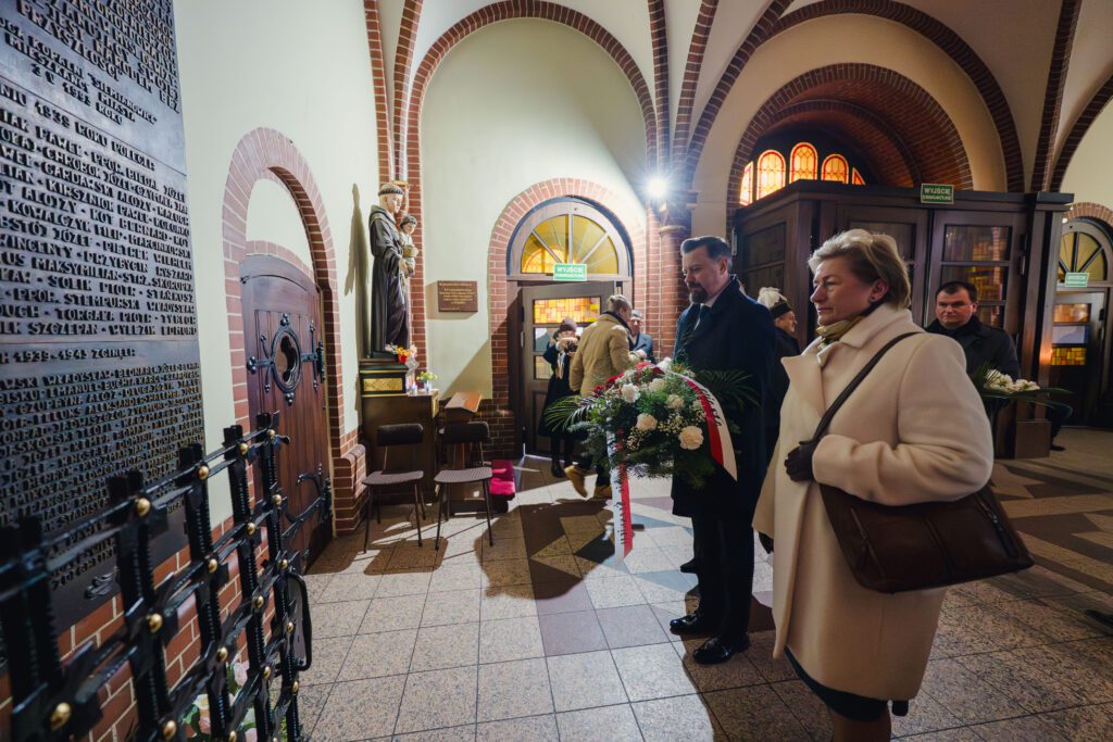 Prezydent Miasta Rafał Piech składa wiązankę kwiatów przy tablicy poświęconej górnikom w przedsionku kościoła św. Michała Archanioła