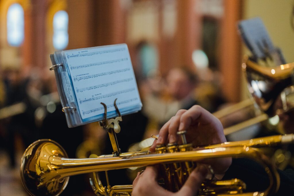 Muzyk orkiestry dętej podczas oprawy mszy św. w kościele św. Michała Archanioła