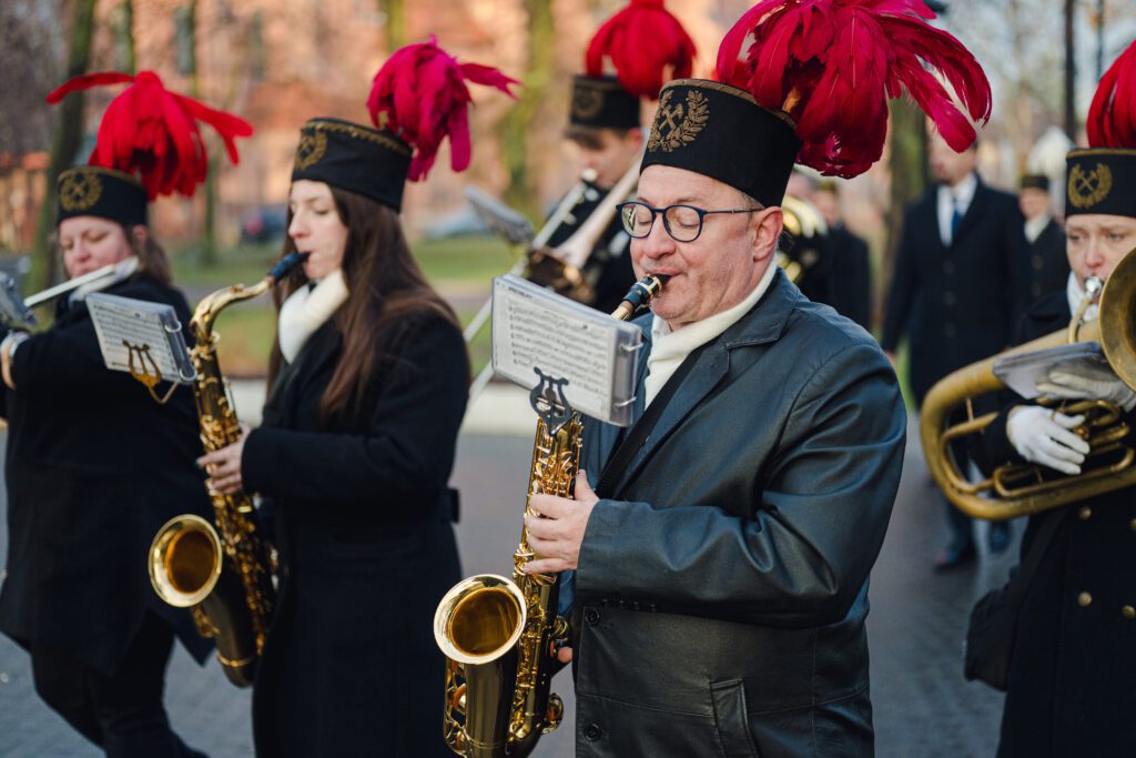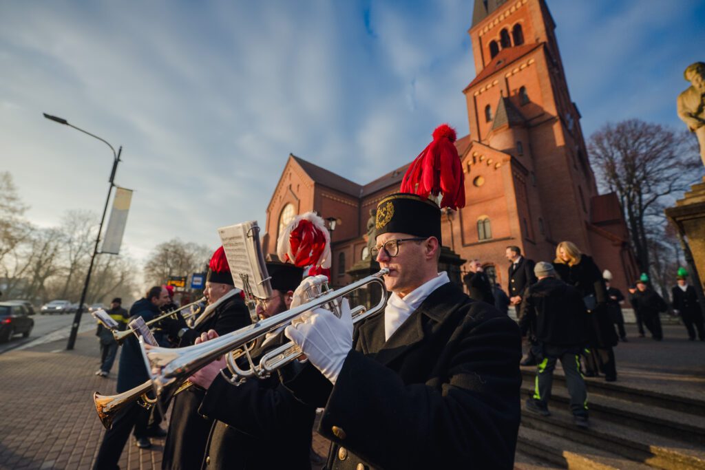 Orkiestra dęta przed kościołem św. Michała Archanioła podczas obchodów BarbórkiTradycyjny przemarsz i śniadanie barbórkowe
