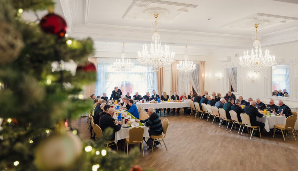Śniadanie barbórkowe – górnicy zasiadają przy wspólnym stole po porannych uroczystościach