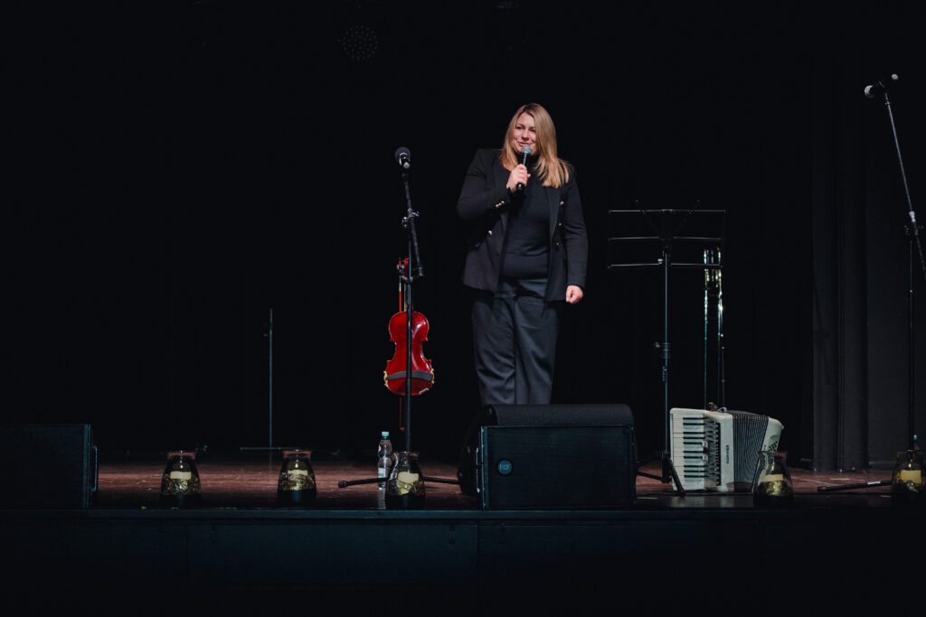 II Zastępca Prezydenta Miasta Beata Gałecka wita publiczność przed koncertem Barbórkowym w SCK „Bytków”.