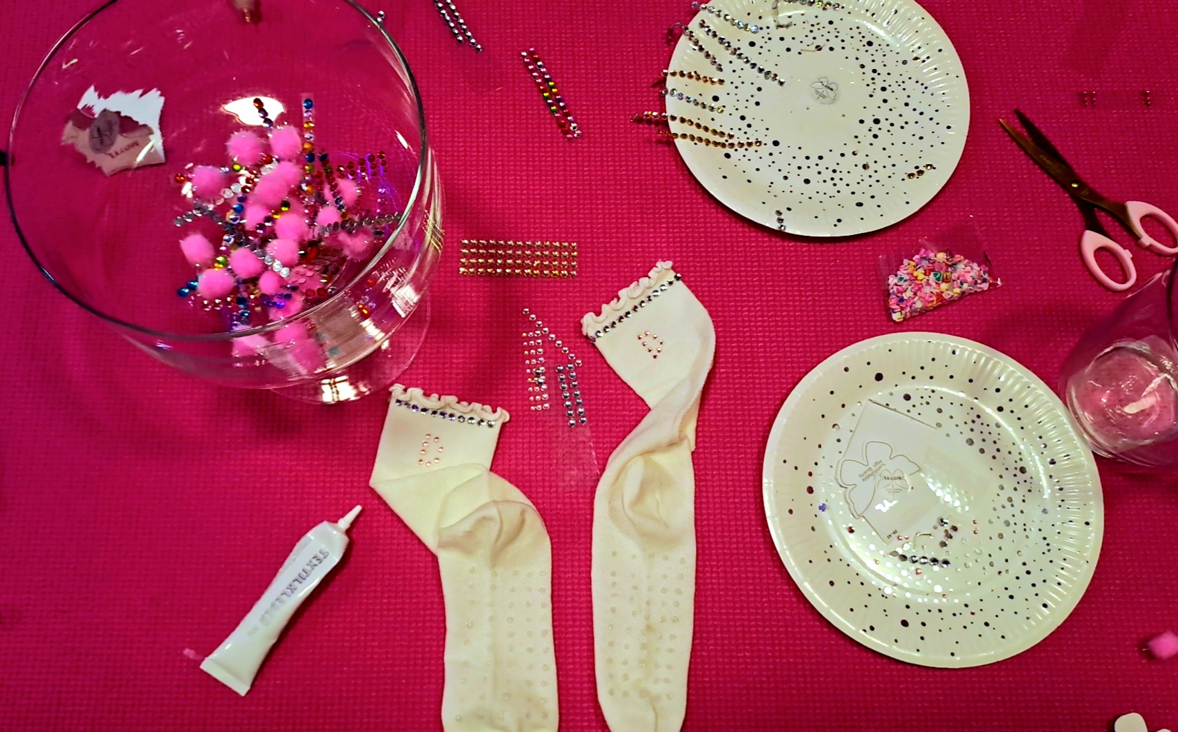 Między treningami przyszedł czas na coś totalnie innego – warsztaty DIY. Każda z nas mogła stworzyć własne antypoślizgowe skarpetki do pilatesu. Do dyspozycji były cekiny, kryształki, konfetti, brokaty, pomponiki i mnóstwo innych ozdób. To było niesamowicie relaksujące. Siedziałyśmy, ozdabiałyśmy, śmiałyśmy się, wymieniałyśmy pomysłami.