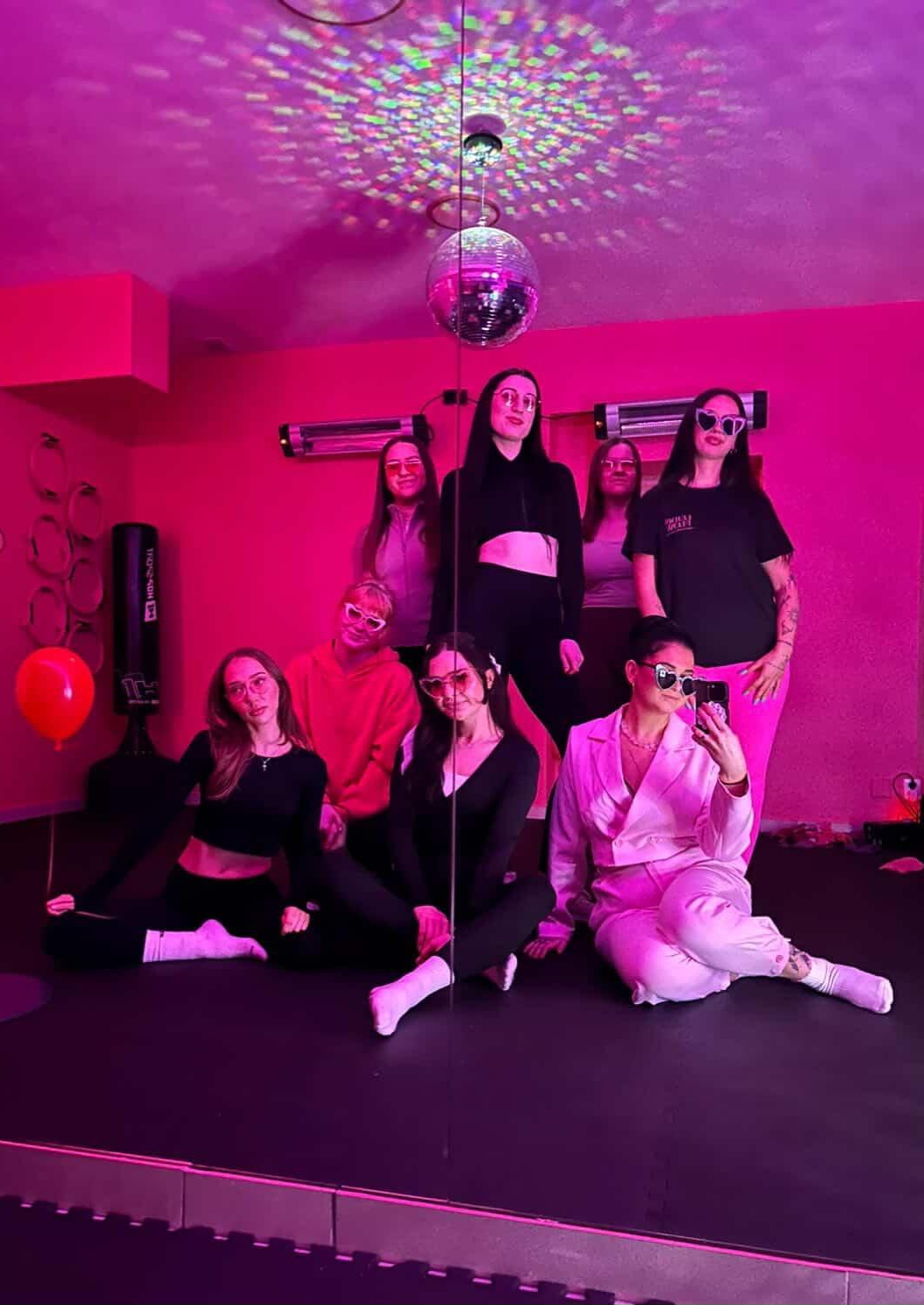 Sala była przyciemniona, z różowymi akcentami i kulą dyskotekową nad głową, co tworzyło klimat jak z kobiecego filmu o self-love. Zajęłyśmy miejsca przy drążkach, gdzie czekały na nas pięknie zapakowane prezenty od partnerów wydarzenia – miły detal, który od razu wywołał uśmiech. Trenerka Ola – sympatyczna, uważna i pełna zaangażowania – dokładnie tłumaczyła technikę, korygowała postawę i motywowała do działania. Dzięki lustrom mogłyśmy na bieżąco kontrolować ruch i naprawdę poczuć pracę mięśni. Było intensywnie, ale w najlepszym tego słowa znaczeniu.