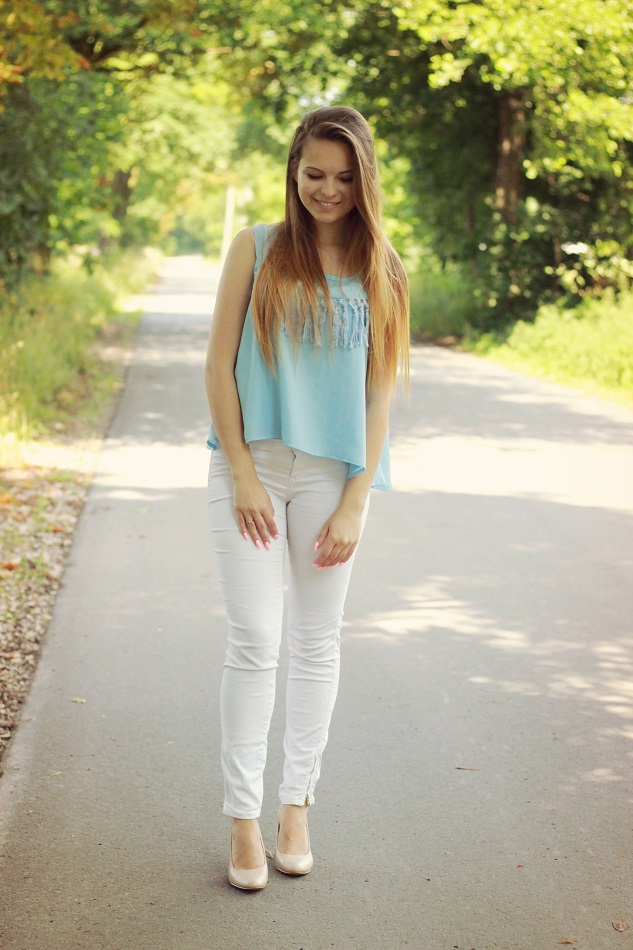 Jak wiecie, uwielbiam styl 'boho', więc nie bez przyczyny upolowałam kolejną bluzkę. Mogę mieć wszystko związane z tym klimatem: od piżamy po stylizację na wesele. Dziś jak widzicie postawiłam na błękitną górę z urokliwymi frędzelkami, dzięki którym całość ma genialny charakter. Latem styl boho pozostawia ogromne pole do popisu i nikogo nie dziwi fakt, iż co trzecia dziewczyna śmiga w bluzkach z frędzlami czy zamszowymi narzutkami. Uwielbiam to jak swobodnie, a zarazem oryginalnie można się czuć w takiej stylizacji.