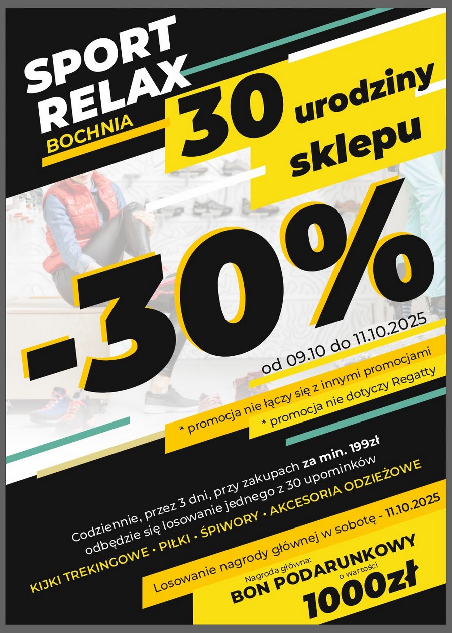 🔸 Bochnia. Sklep Sport Relax świętuje 30. urodziny – przez 3 dni zniżki, nagrody i wielkie losowanie!