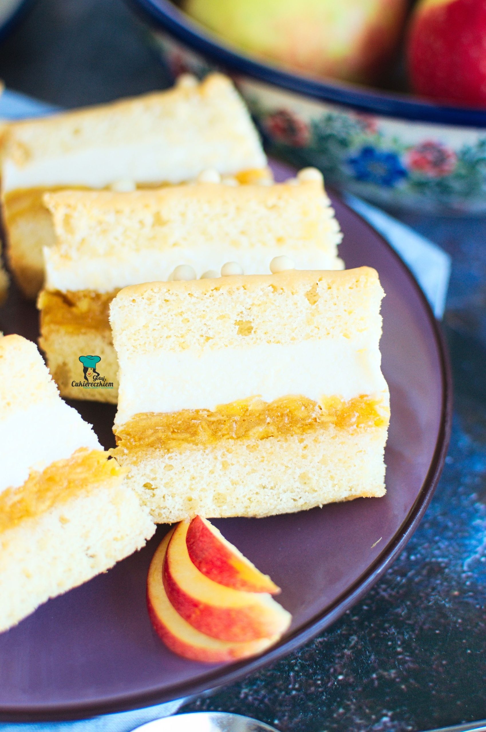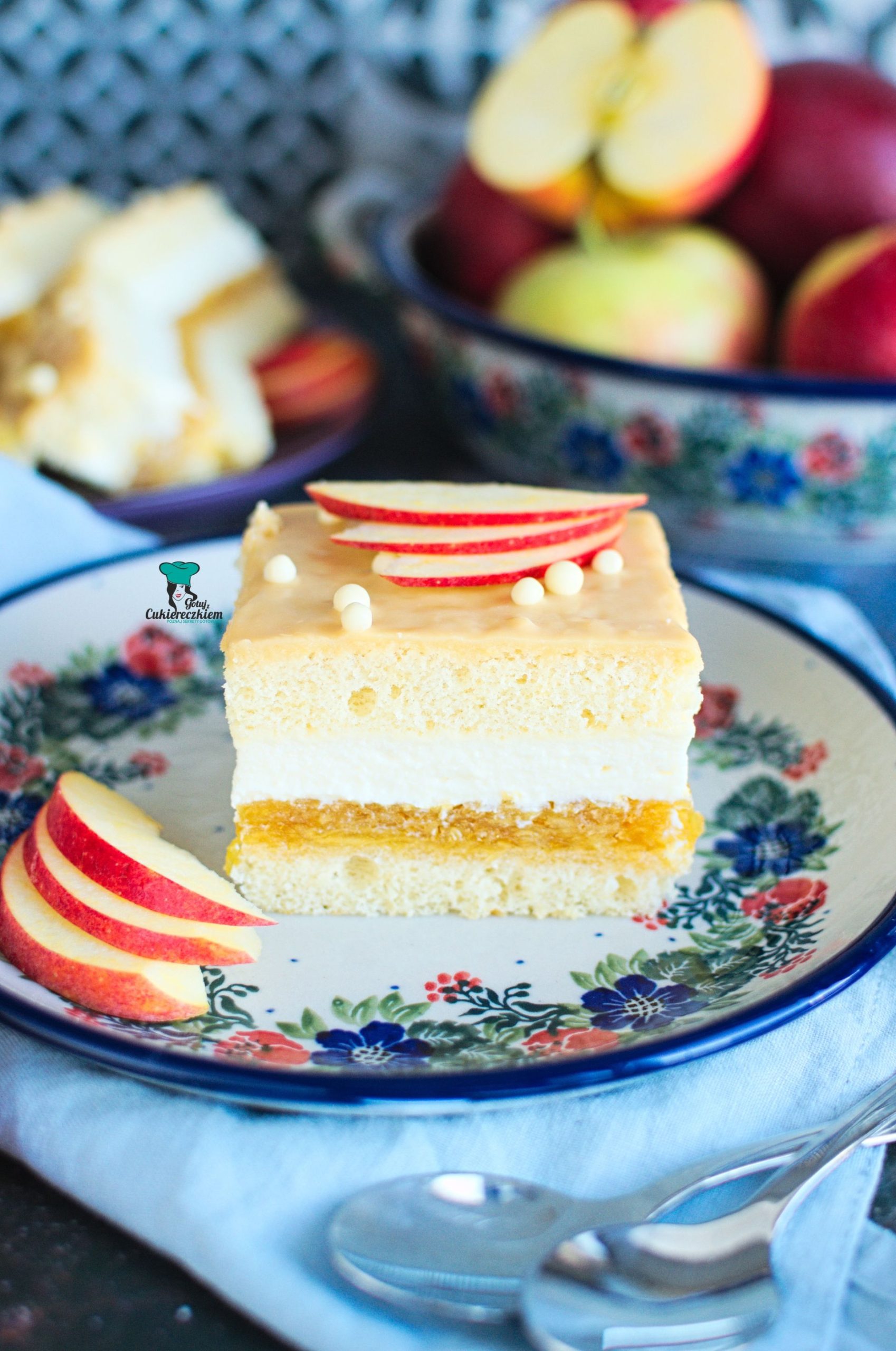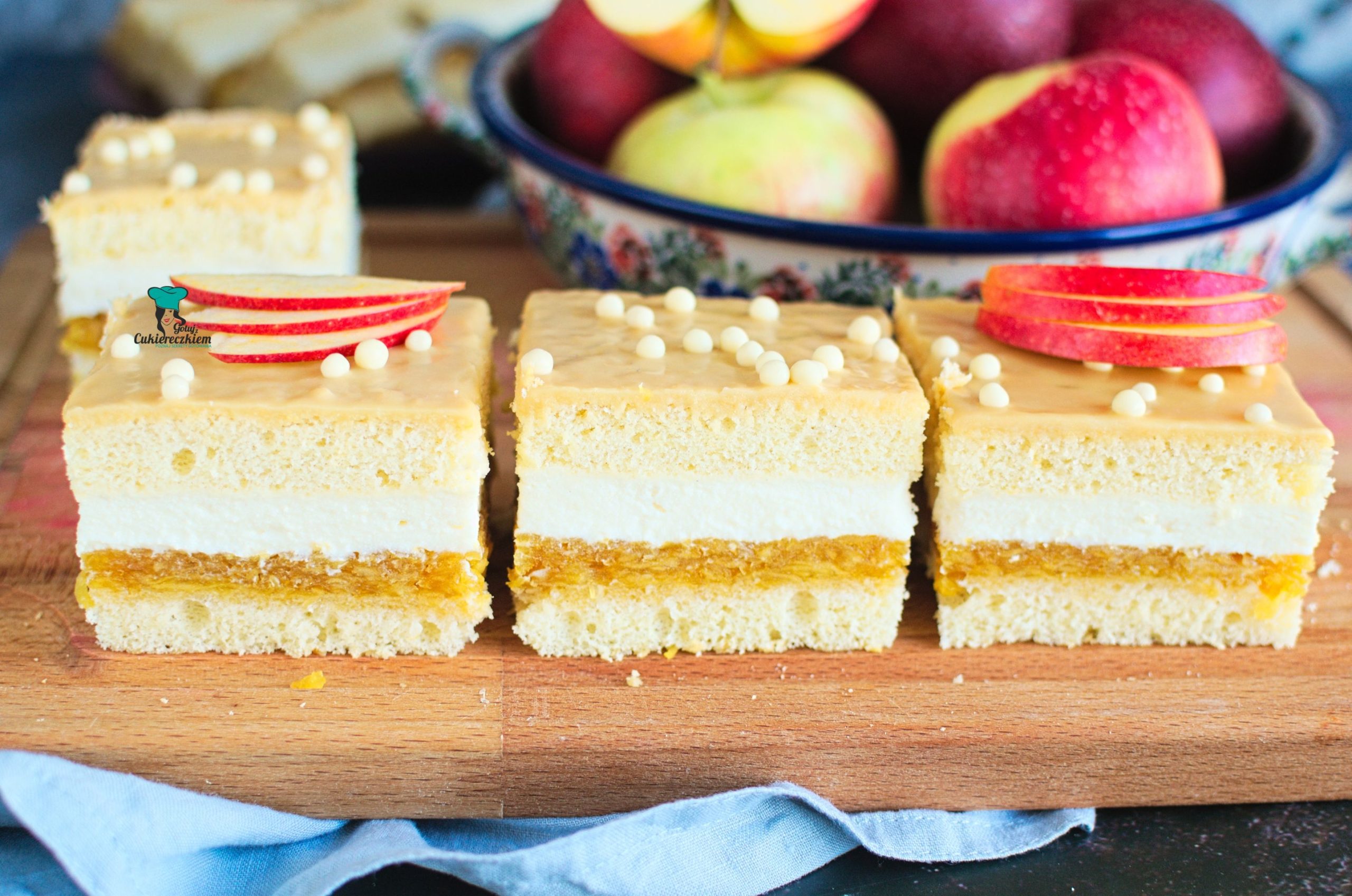 Pyszne ciasto z gotowanymi jabłkami w galaretce, z kremem budyniowym i polewą karmelową.