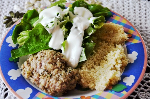 Moim przykładowym obiadem jaki dla Was przygotowałam jest pulpet z mięsa indyka z ziołami do tego sałata polana jogurtem 0% i kasza jaglana ze szczyptą soli.