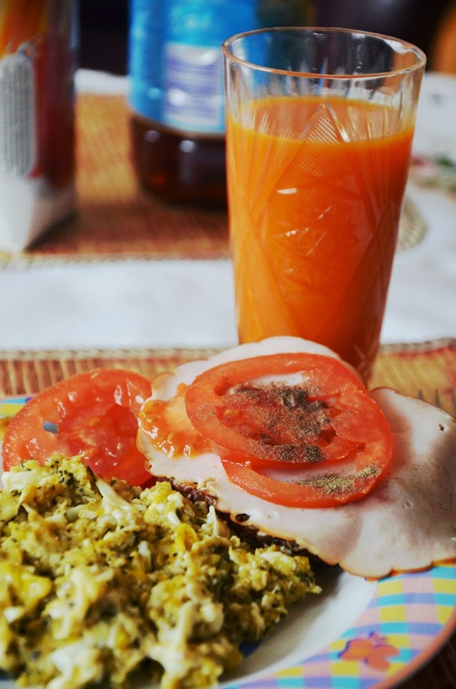 Moim śniadaniem najczęściej są kanapki z ciemnego pieczywa z ziarnami ,chuda wędlina i pomidor z dużą ilością pieprzu do tego sok marchewkowo-jabłkowy.
