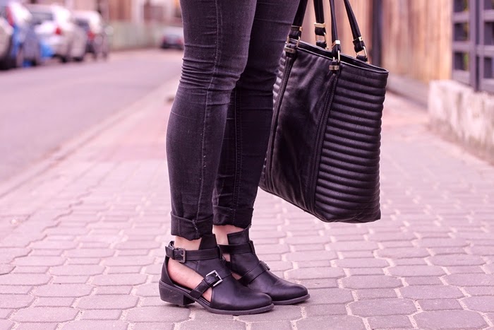 Dziś w roli głównej buty typu cut out, które od jakiegoś czasu są bardzo popularne wśród blogerek. Muszę przyznać, iż dość długo zastanawiałam się nad ich kupnem. Główną moja obawa dotyczyła praktyczności tych butów, ale jak się okazało są one idealne na obecną temperaturę i jak również są bardzo wygodne. Drugi post z rzędu z tą samą kurtką, która idealnie pasuje do butów i prostej torby z H&M upolowanej na niedawno wyprzedaży. Jak widać przez cały czas hołduję zasadzie im prościej tym lepiej :) Choć muszę przyznać, iż wraz z nadejściem wiosny mam ochotę na kwiatowe wzory i intensywne kolory.