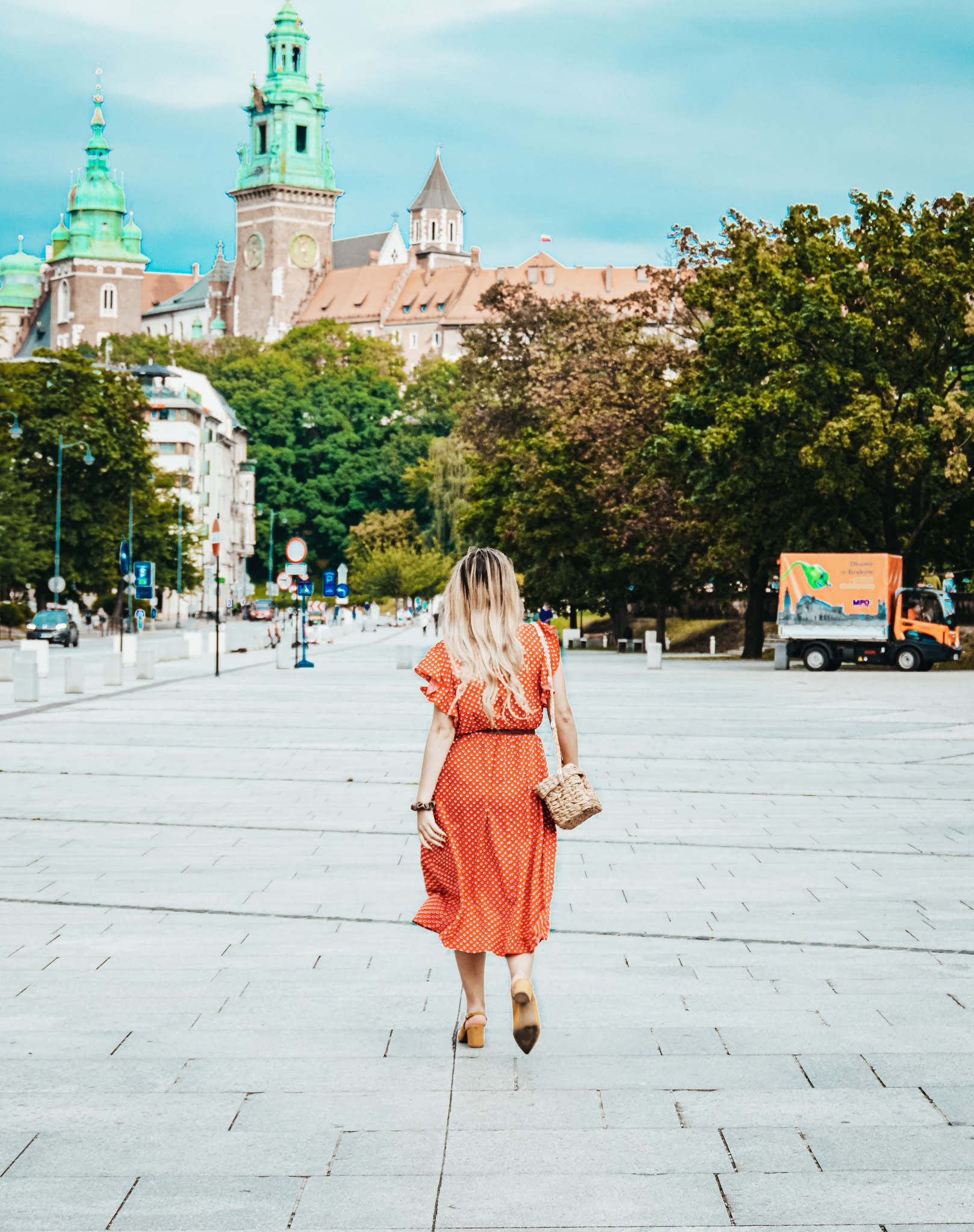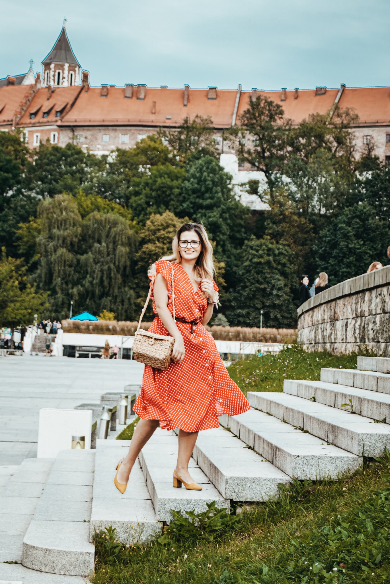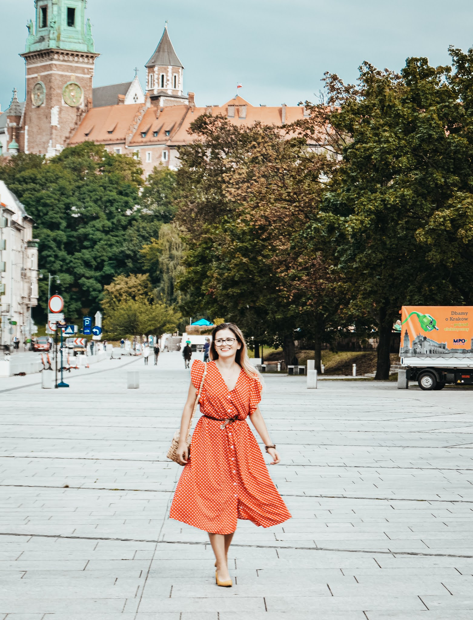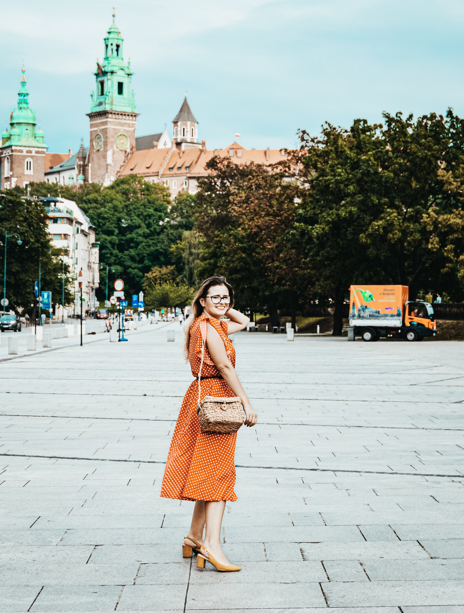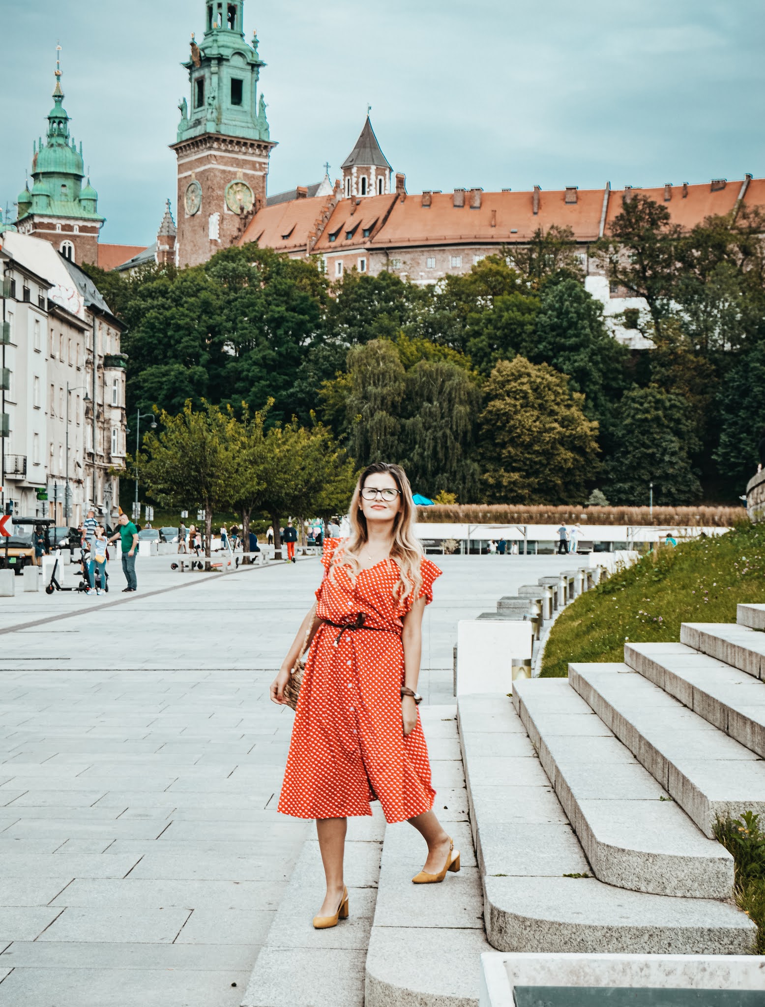 Sama zastanawiam się czy to szczęście, czy może już wypracowana przez lata umiejętność. Ale tak, tą sukienkę kupiłam w second-handzie. Stan idealny, efekt sukienki moich marzeń został osiągnięty. Na metce ma rozmiar XL, jednak po przewiązaniu w talii skórzanym paskiem pasuje jak idelna oversizowa sukienka na lato.Wspaniale czuję się w tego typu fasonach. Uwielbiam zakładać takie stroje na spacery po mieście kiedy wiatr porusza sukienką nadając jej pięknego kształtu i zwiewności. Gdyby nie rok 2020, to na pewno ta sesja byłaby zrobiona w Paryżu pod cudowną Wieżą Eiffla o której odwiedzeniu marzę już od dawna. Jednak sądzę żę nasz polski Zamek Królewski na Wawelu też prezentuje się tutaj pięknie.
