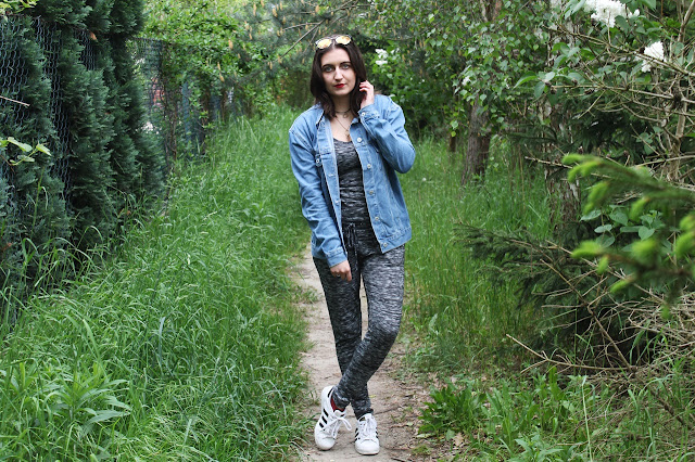 Chyba w końcu wracam do systematyczności! 3 post w ciągu miesiąca? Oby tak dalej haha :D Wydaje mi się, iż to zasługa wiosny, która aż motywuje do działania. Bo co innego jak nie słońce, daje nam kopa, żeby nie siedzieć w domu i nic nie robić? Dzisiaj przychodzę do was z dosyć prostą stylizacją. Dresowy kostium, o którym zapomniałam na 2 lata ( serio, nie wiem jak mogłam?!) i wrócił do łask, dzięki swojej wygodzie. Muszę zapytać czy tylko ja tak się cieszę, iż powróciły do sklepów te szerokie, poprzecierane rodem z lat naszych rodziców kurtki jeansowe? Osobiście jestem w nich zakochana :) Moją wyhaczyłam tutaj - klik i jestem z niej strasznie zadowolona.