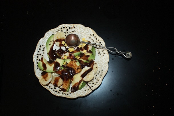 owoce i kroimy w plasterki, awokado dodatkowo w półksiężyce, układamy na