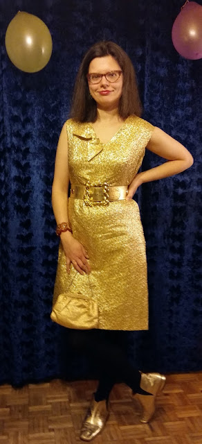 Wizja mojego stroju na Sylwestra zaczęła się kształtować wiele miesięcy temu, a dokładnie w dniu w którym kupiłam sukienkę z lat 60. To oryginał: krój trapezowy, cała przetykana złotą metalizowaną nicią, dekolt karo z przodu i tyłu a do tego mała kokarda ku ozdobie. Na początku nie wiedziałam jak ją „ugryźć”, ale już po chwili oświeciło mnie, iż to najlepsza sukienka na sylwestra w duchu vintage. Z czasem zaczęły dochodzić następne złote dodatki: botki, malutka wieczorowa torebka, bransoleta z zatopionym złotym konfetti.. I o to jest moja stylizacja sylwestrowa - tzw. „total look” albo wręcz „total gold look” => w moim przypadku