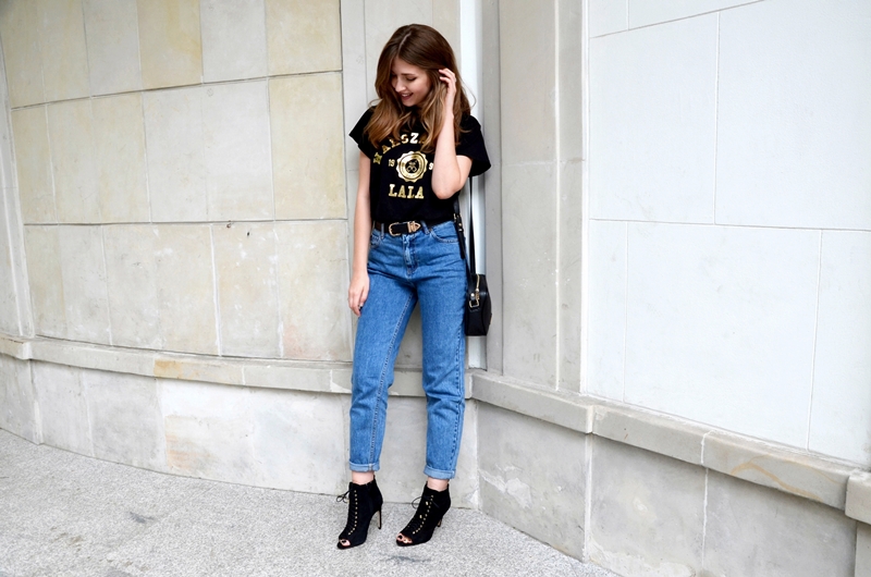 Połączenie t-shirtu (zwłaszcza wpuszczonego w spodnie) i mom jeans przywodzi na myśl lata 90, zaś sznurowane botki peep toe dodają odrobinę bardziej współczesnego modowego ducha. Mam nadzieję, iż taka kombinacja Wam się spodoba.