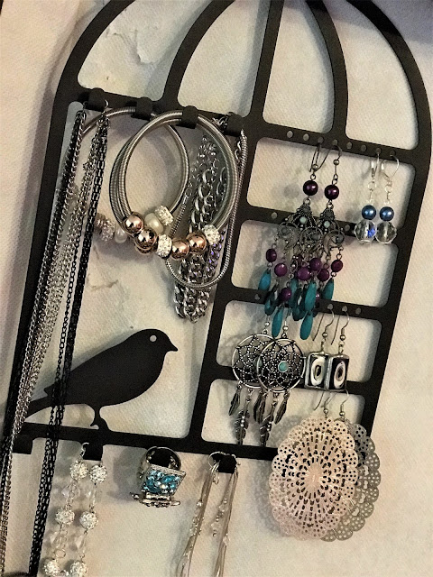 Nie mam osobnej garderoby, więc stojaki nie są w moim guście, bo wymagają miejsca. Dlatego wieszak ze "sroczką" we wzorze - bo lubi błyskotki, wpisał się w moją koncepcję i w mój kuferek z biżuterią.