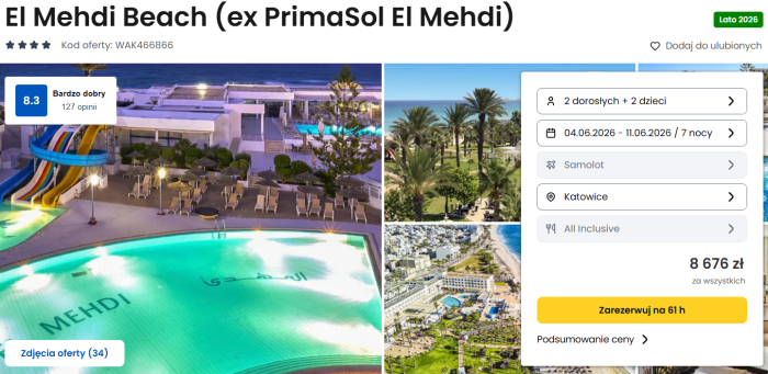 To dobry wybór na niedrogie wakacje all inclusive w Tunezji, z ładną plażą i miłą obsługą. Często pojawiają się pochwały dla animacji, czystości basenów oraz przyjaznego podejścia do dzieci. Niektórzy goście wspominają o powtarzalnym jedzeniu czy starszym wyposażeniu, ale jednocześnie podkreślają, iż rekompensuje to cena i położenie hotelu. To obiekt z bardzo dobrym stosunkiem ceny do jakości, idealny dla osób szukających słonecznego wypoczynku w Mahdii bez nadwyrężania budżetu.