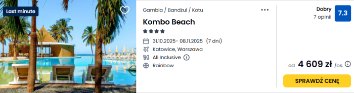 Kombo Beach leży bezpośrednio przy szerokiej plaży w Kotu. Oferuje pokoje z klimatyzacją, TV i Wi-Fi – wygodne zaplecze do wypoczynku po dniu pełnym atrakcji. Na terenie obiektu znajdują się duży basen z wydzieloną częścią dla dzieci, bary i 2 restauracje. Przy basenie i na plaży działa serwis przekąsek. Klienci mogą skorzystać z kortów (m.in. tenis/padel) oraz bogatego programu wieczornych animacji i muzyki na żywo. To kompletny kurort na słończne wakacje w Gambii – idealny dla par, rodzin i osób ceniących aktywny wypoczynek.
