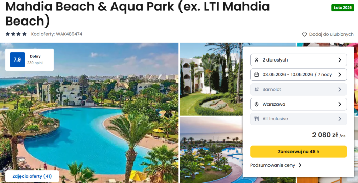 Mahdia Beach & Aqua Park opisywany jest idealny na rodzinne wczasy. Polscy turyści podkreślają szeroką plażę, duży basen oraz wygodny dostęp do aquaparku, co pozwala ciekawie spędzać czas bez opuszczania obiektu. W recenzjach często pojawiają się pochwały za sympatycznych animatorów, czystość w częściach wspólnych i przyjemny klimat typowego kurortu all inclusive.