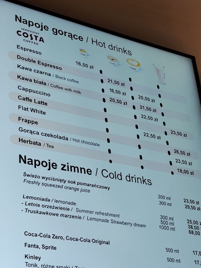 Czyli: o ile liczyłeś na „łyk szybkiej czarnej” przed odlotem – zaplanuj ~20–22 zł.