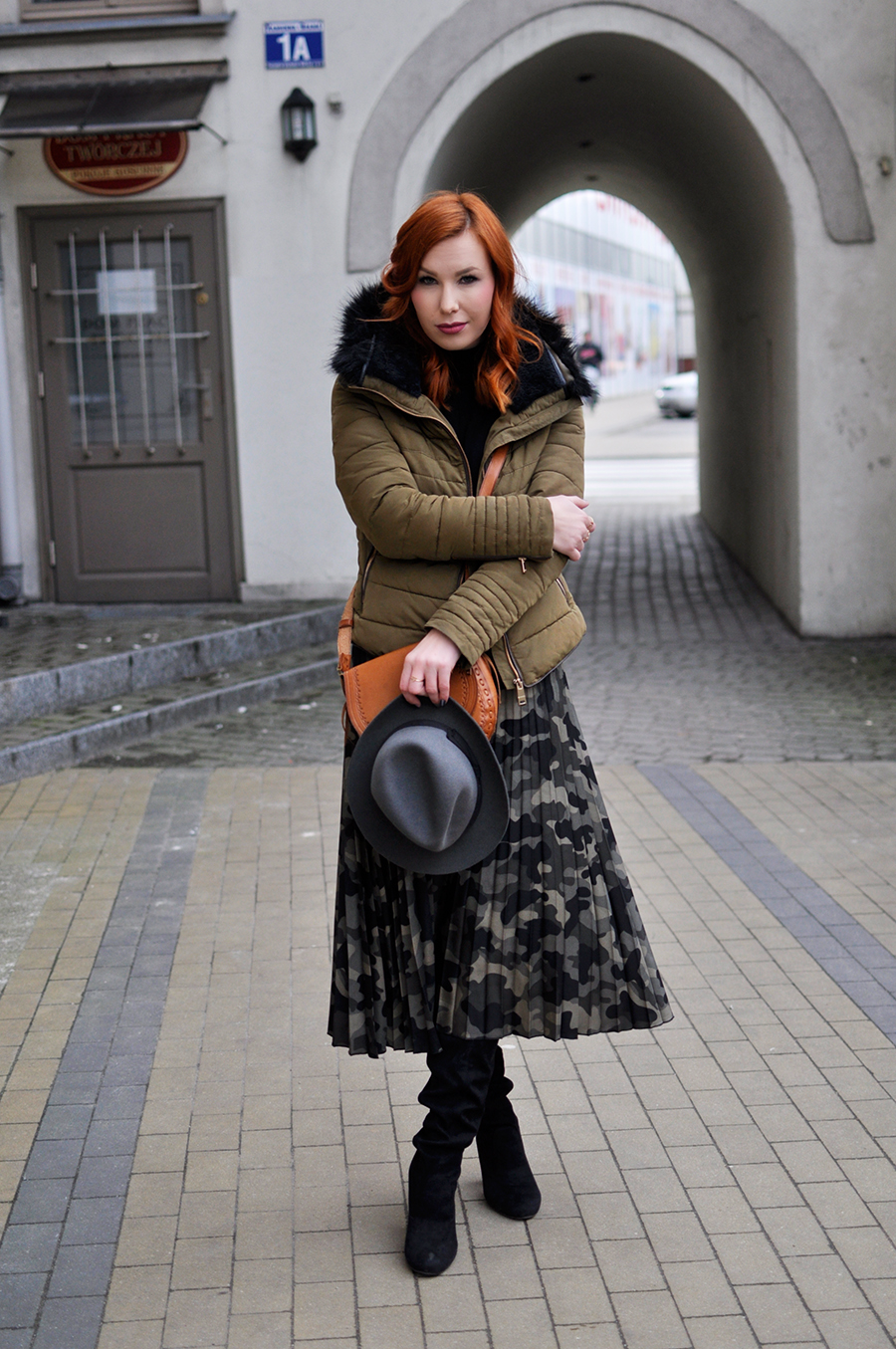 Nie mogłam się oprzeć tej spódnicy. Oczywiście przede wszystkim, iż plisowana, a poza tym ten wzór doprawdy mnie urzekł. Do tego iście wojskowe buty, no bo przecież za kolano. Mimo, iż słupki rtęci wędrują coraz bardziej ku górze, nie chowajcie ich jeszcze na spód szafy. Kozaki za kolano sprawdzą się jeszcze wiosną, więc warto mieć je pod ręką. Torebkę za to dopasowałam na zasadzie kontrastu. Lubię przemycać do stylizacji elementy z pozoru niepasujące. Tutaj torebka góralska podkówka. Dorobiła się już wymyślonej historii, jak większość z lumpeksowych zdobyczy.