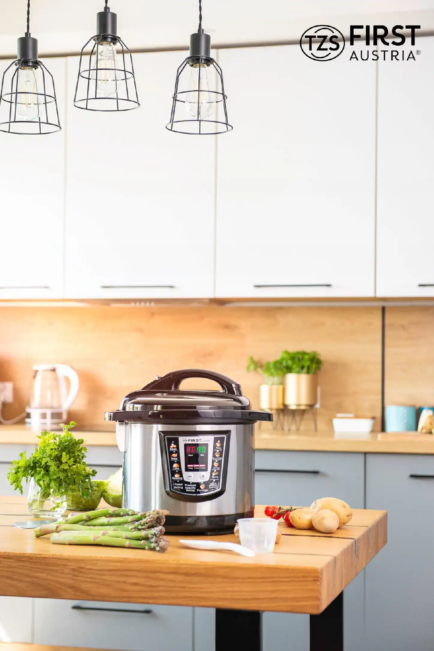 First Austria 5130-2-SI to wielofunkcyjny multicooker, który wyróżnia się mocą 1500 W i pojemnością 5 litrów, pozwalając na przygotowanie posiłków dla 4-5 osób. Urządzenie oferuje 12 programów gotowania, obejmujących m.in. gotowanie na parze, smażenie, pieczenie, opiekanie czy wolne gotowanie. Zapewnia to elastyczność w kuchni. Jest on wyposażony w regulację temperatury od 40 do 240°C oraz timer z opóźnionym startem do 24 godzin, co ułatwia zarządzanie czasem. Wnętrze pokryte powłoką antyadhezyjną zapobiega przywieraniu potraw. Dodatkowo w zestawie znajduje się kosz do smażenia, ruszt do gotowania na parze oraz 6 widelców do fondue. Model ten jest szczególnie ceniony za wszechstronność, pozwalającą na zastąpienie wielu sprzętów kuchennych. Jego wadą może być rozmiar, co wymaga odpowiedniej przestrzeni do przechowywania. First Austria 5130-2-SI stanowi atrakcyjną opcję dla osób poszukujących kompleksowego rozwiązania do przyrządzania różnorodnych dań, szczególnie dla rodzin i tych, którzy cenią sobie wygodę.