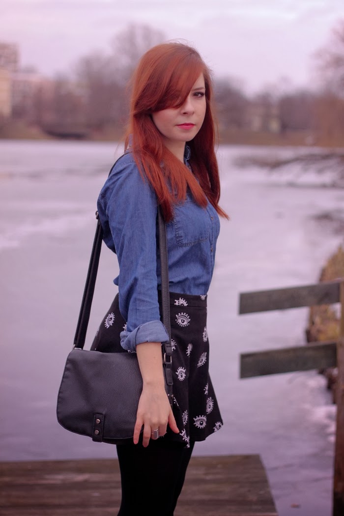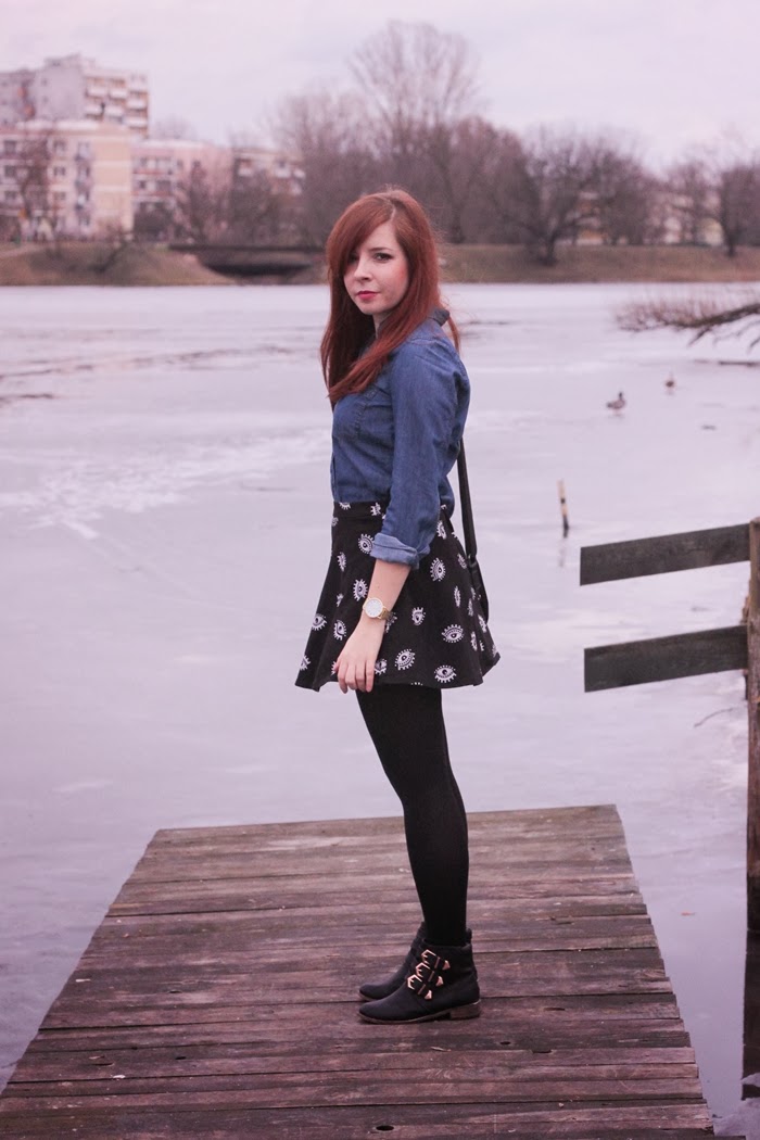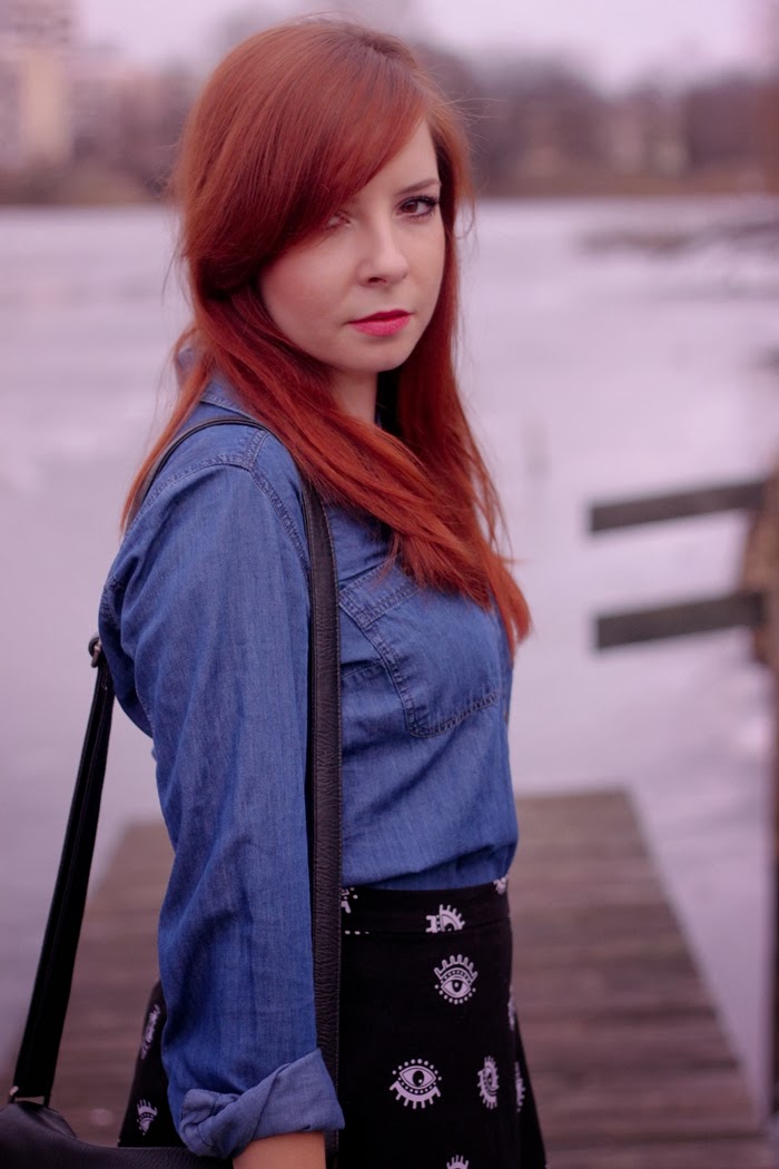 Jestem miłośniczką wszelkiego typu koszul, więc nie mogło w mojej szafie zabraknąć również jeansowej. Jest to już klasyka jak czarne rurki czy beżowy trencz. Jeans niezmiennie znajduję się na topie od wielu lat, to swoisty mundur wszech czasów. Równie gorącym trendem jest jeansowy total look. Muszę przyznać, iż również jestem jego zagorzałą zwolenniczką! Dziś jednak połączyłam jeansową koszulę z rozkloszowaną spódnicą w interesujący deseń. Jest dziewczęco i stylowo, czyli tak jak lubię :)