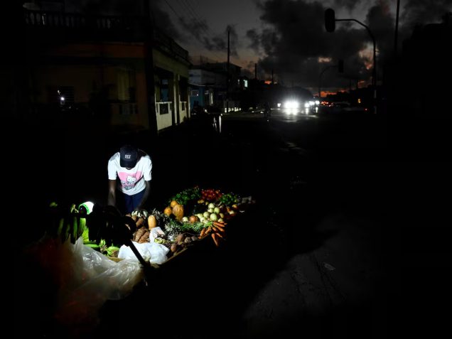 Mężczyzna sprzedaje warzywa na ulicy podczas przerwy w dostawie prądu w Hawanie, podczas gdy Kubańczycy z różnych środowisk próbują przetrwać, radząc sobie z pozornie niekończącymi się przerwami w dostawie prądu i rosnącymi cenami żywności, paliwa i transportu w obliczu rosnącej presji USA na Kubę.