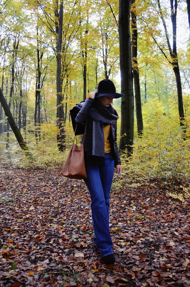 Kapelusz to jeden z moich ulubionych akcentów jesiennych stylizacji. Tutaj jest czymś pomiędzy - z jednej strony nawiązuje do klimatu boho, a z drugiej jego kolor łączy go z resztą ciężkich dodatków.