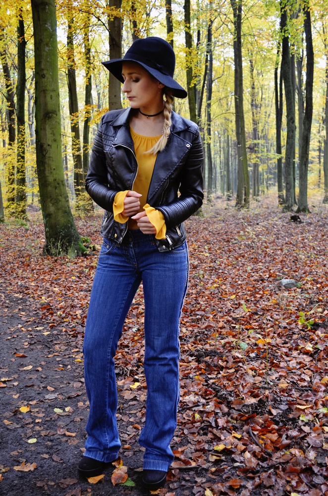 Ogólnie myślałam, iż ten krój spodni nie jest dla mnie. Zawsze wybierałam rurki, bądź spodnie z prostą nogawką. A jednak - odważyłam się i było warto. Te spodnie są idealnym dopełnieniem całego zestawu. Dodatkowo ten odcień jeansu idealnie kontrastuje z odcieniem bluzki. Całość zachowana jest w klimacie boho - spodnie to typowe dzwony, a bluzka ma piękne, szerokie rękawy, które jednak dziś postanowiłam schować, inspirując się nieco ostatnim postem Karoliny Ościk. Aby nie było zbyt idyllicznie, postawiłam na ciemne i ciężkie dodatki.