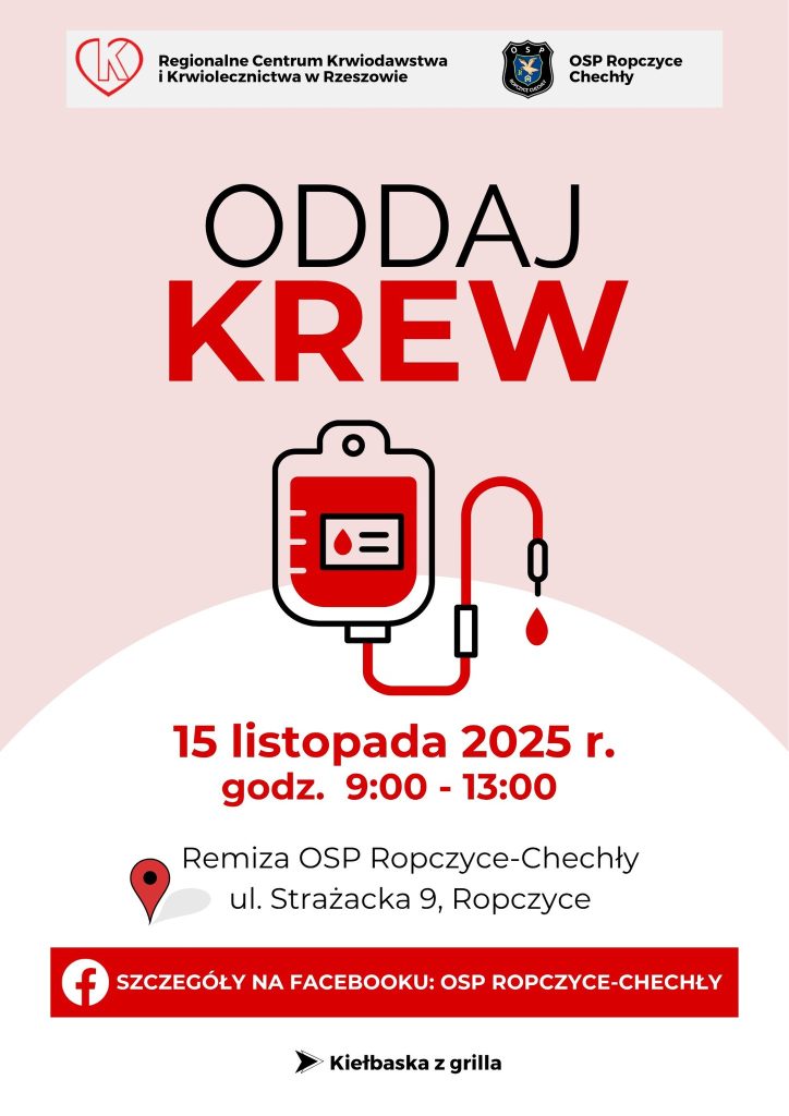 Już 15 listopada 2025 r. w remizie OSP Ropczyce-Chechły odbędzie się akcja krwiodawstwa organizowana wspólnie z Regionalnym Centrum Krwiodawstwa i Krwiolecznictwa w Rzeszowie.