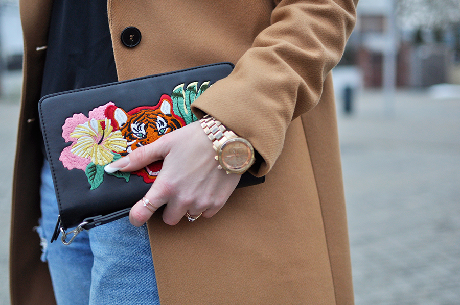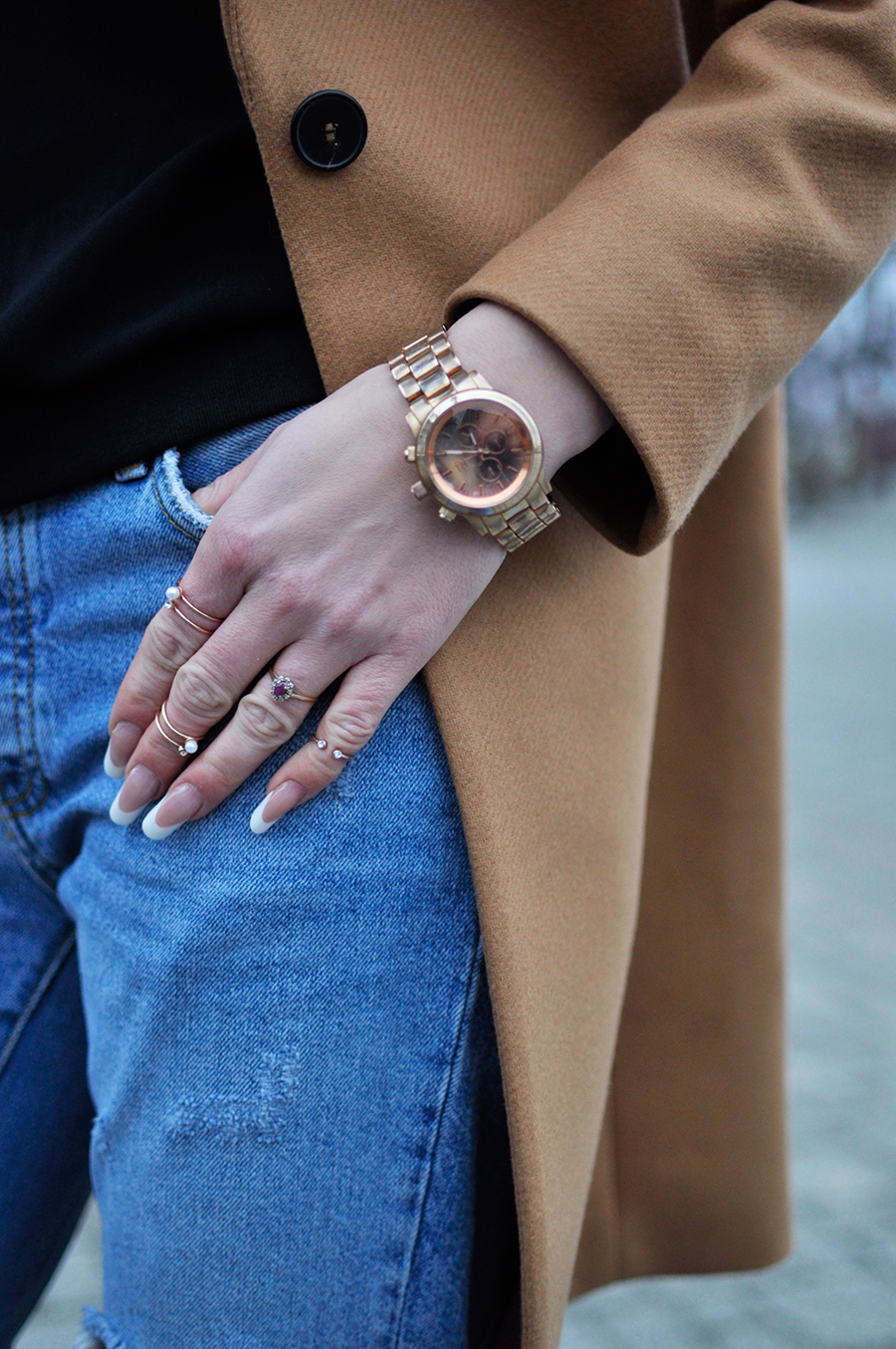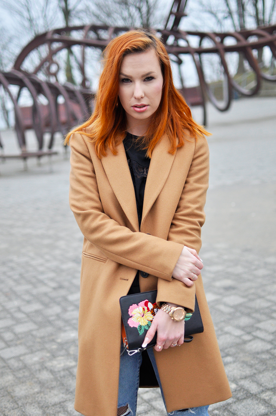 SPODNIE BERSHKA BLUZA BERSHKA PŁASZCZ ZARA KABARETKI GATTA PORTFEL PARFOIS BUTY ZARA ZEGAREK RIVER ISLAND PIERŚCIONKI H&M