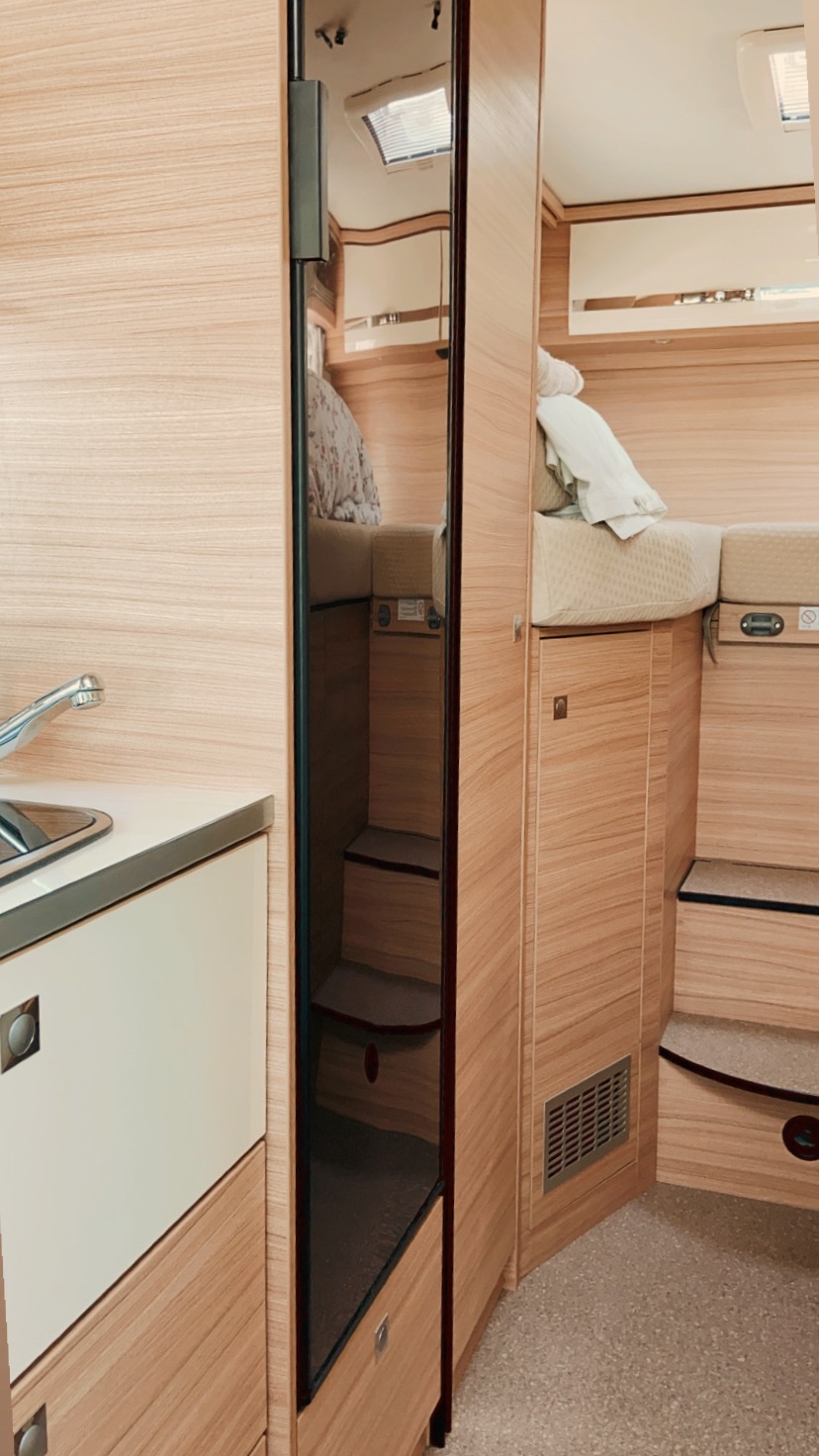 W naszym kamperze było jedno łóżko, ale za to bardzo duże. Spokojnie wystarczało dla całej trójki, a choćby mieścił się nasz psiak. Przy łóżku były specjalne siatki zabezpieczające przed upadkiem. Mnie spało się tam wyjątkowo dobrze.