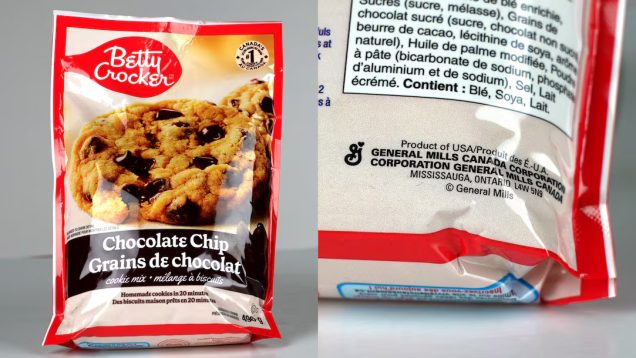 Na przedniej stronie opakowania mieszanki do ciasteczek z kawałkami czekolady Betty Crocker widnieje napis „Najlepiej sprzedająca się marka mieszanki do pieczenia w Kanadzie”. Z tyłu widnieje napis „Product of USA”