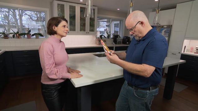 Rosa Marchitelli, współprowadząca program Marketplace, i Dave Lawson, współkonsumenci, przyglądają się etykietom produktów.