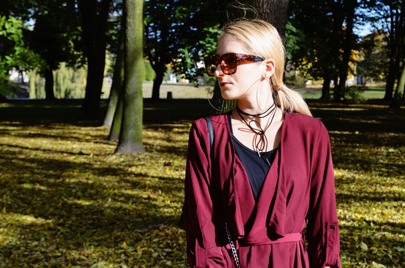 Bordo, kolor wina to zdecydowanie mój 'must have' na jesień! Ostatnio do mojej szafy trafiło kilka rzeczy w tym kolorze, z czego się niezmiernie cieszę. To kolor jesienny, ale też bardzo kobiecy. Płaszcz, narzutka, pochodzi ze strony SHEIN.COM. Ma interesujący krój i kolor, który skradł moje serce. Dobrałam do niego dodatki w kolorach czarnym i srebrnym. Duże kolczyki koła, czy wiązany choker to moim zdaniem naprawdę świetne trendy. Kozaki za kolano - tutaj może tego nie widać, ale takie właśnie są. Uwielbiam je od zeszłego roku i jak dla mnie ten trend mógłby nigdy nie wychodzić z mody!
