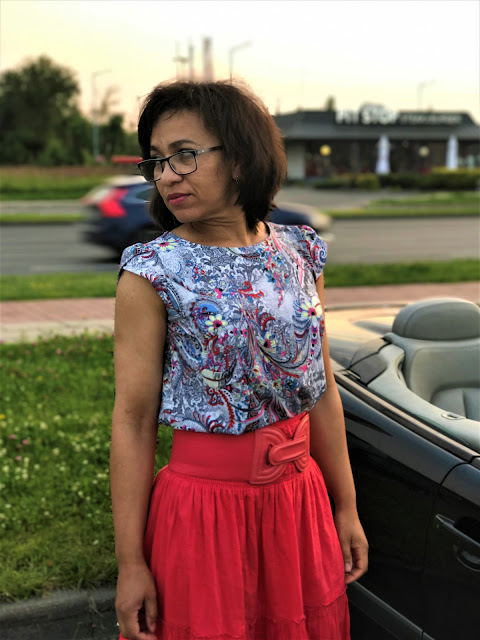 Koralowa spódnica. Moja nowa koleżanka z pracy, którą mogłam spotkać w ubiegłym roku w ówczesnym jej miejscu pracy, po namyśle powiedziała mi, iż pamięta mnie, bo noszę takie zamaszyste spódnice :D Lubię tę spódnicę. Takie maxi spódnice są wbrew pozorom fajne latem, bo są przewiewne. A przez swoją "pracę" na wietrze, dają wrażenie chłodu.