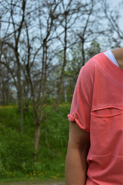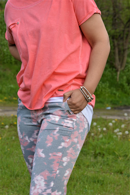T-shirt Twin Koral, dwuczęściowy. Spodnia część, czyli t-shirt na ramiączka, z bardzo miękkiego, przyjemnego materiału, figlarnie wystaje spod koralowego wierzchu na biodrach i dekolcie. Spodnie Malibu, w raczej letnich barwach, wygodne bo elastyczne. Zależnie od dodatków, np. butów mogą być mniej lub bardziej casual.