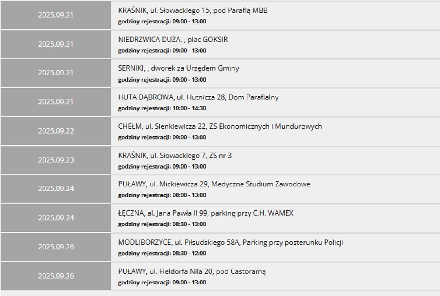 W Hucie-Dąbrowa akcja odbędzie się w domu parafialnym i potrwa od godziny 10.00 do 14.30. W Kraśniku krew będzie można oddać na parkingu przy kościele Matki Bożej Bolesnej od 9.00 do 13.00. W tym samym czasie zaplanowano akcję w Niedrzwicy Dużej. Tu ambulans będzie czekał na krwiodawców pod Gminnym Ośrodkiem Kultury. Również od 9.00 do 13.00 krew będzie można oddać w Sernikach w dworku za urzędem miasta.